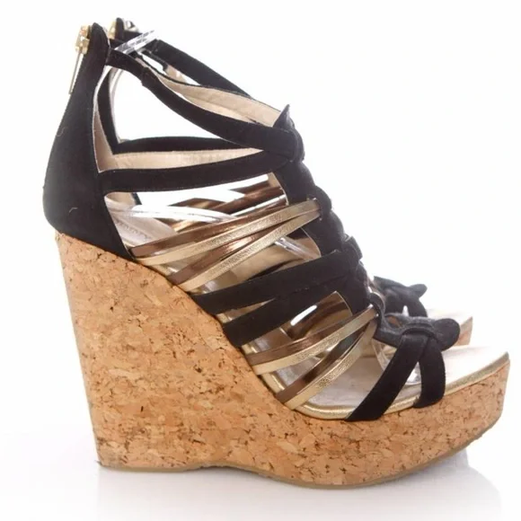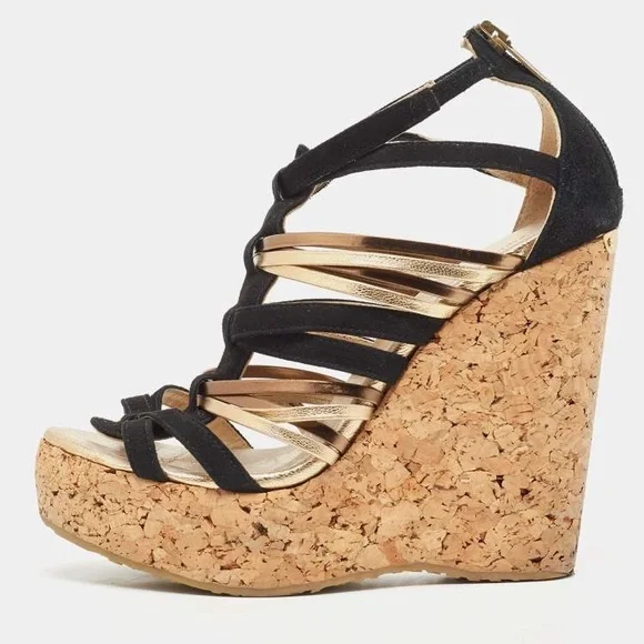 Jimmy Choo Black/Gold Suede and Leather Wedge Sandals Size 39.5