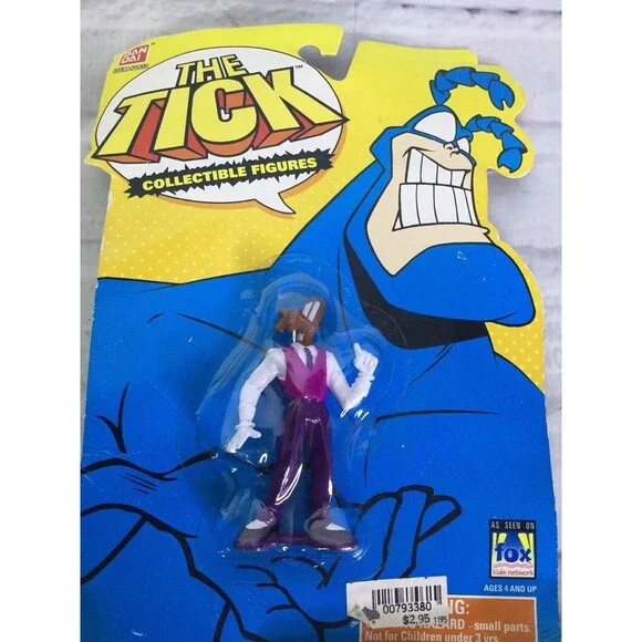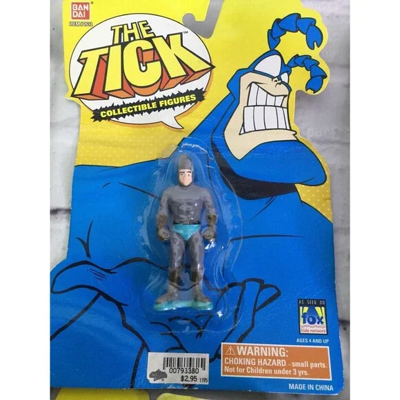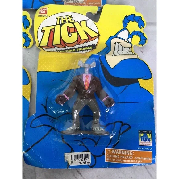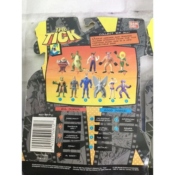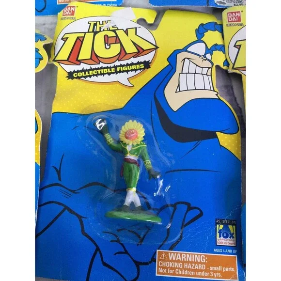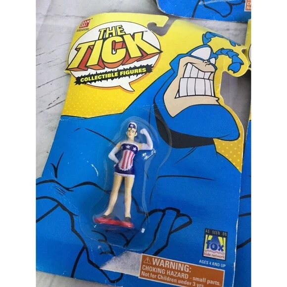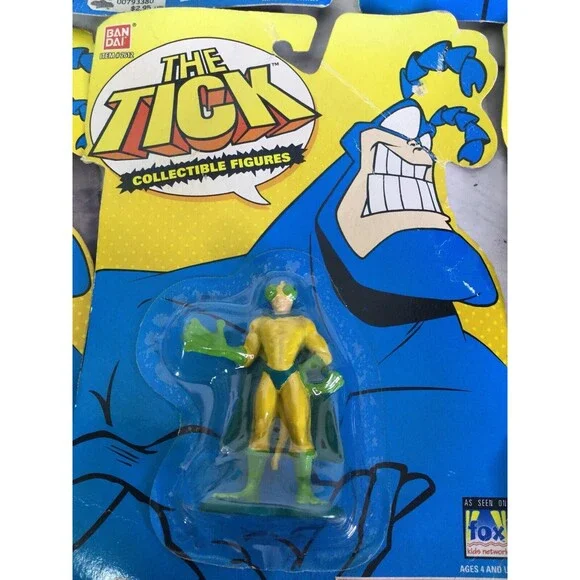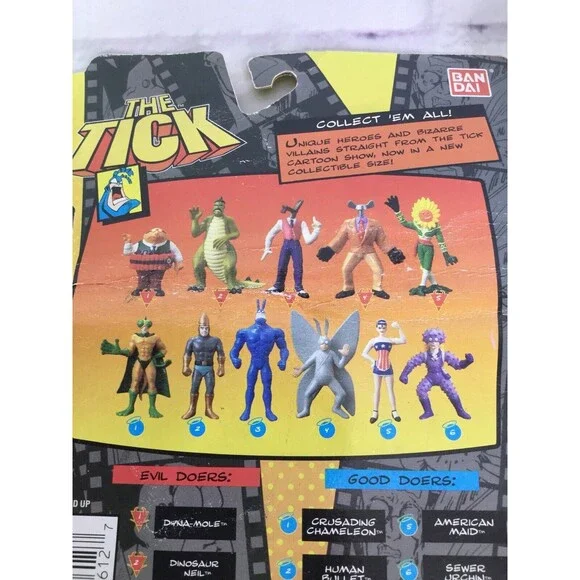 Up for grabs is a sealed Vintage Bandai The Tick 3" Collectible Figures Lot of 7 With Damaged Cards. All cards have some bends, wear, tears, etc. Actual figures have never been removed from cards as noted in photos. SOLD AS IS! Please refer to all photos. Will be packaged and shipped with great care! Ask any questions prior to purchasing! Thanks!The lot includes all figures listed below:1. American Maid2. Human Bullet3. Arthur4. Crusading Chameleon5. El Seed6. Dean7. Chairface Chippendale