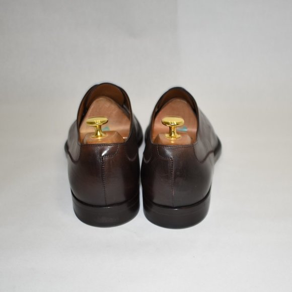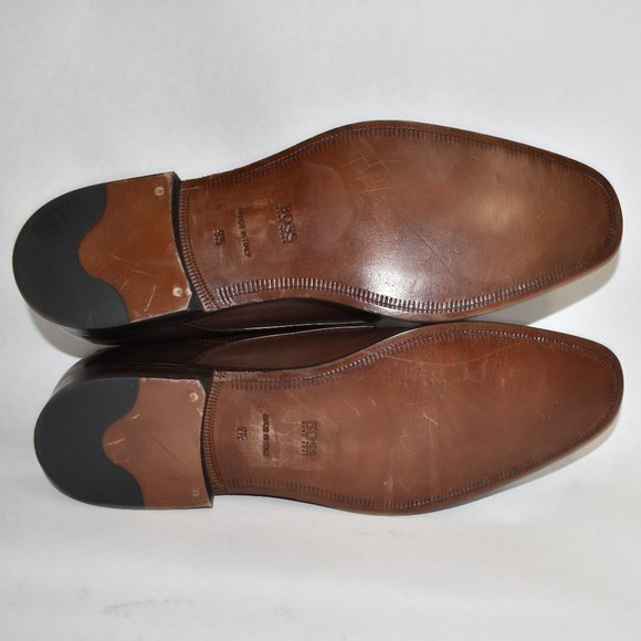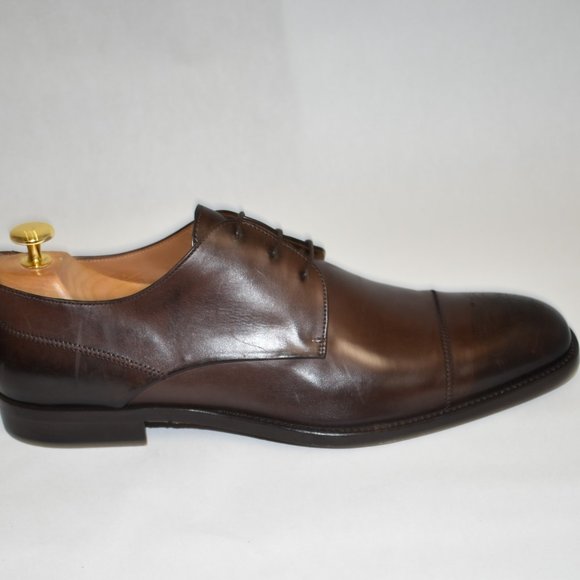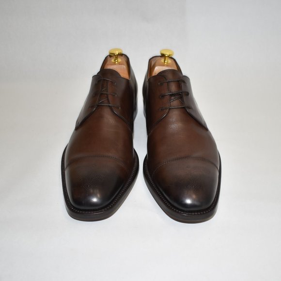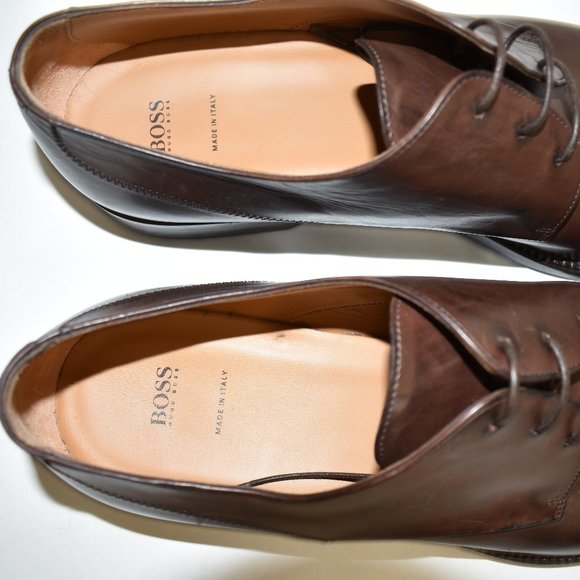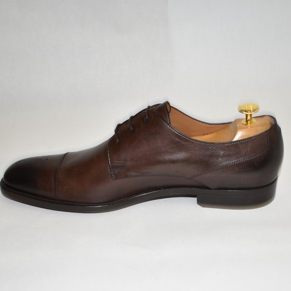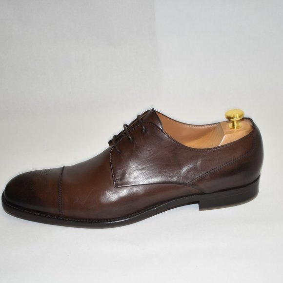 Floor Display - Like New - DD120Hugo Boss Medallion Cap Toe Derby Dark Brown LeatherSize 9.5MSRP $450Cap toe - Medallion - Lace-up closure - Leather construction - Made in ItalyMaterials:Leather upper, lining, and soleShoe trees not included.