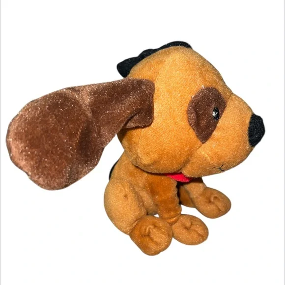 The product is a rare Walmart small brown black and brown ears puppy dog stuffed plush toy with a red bow tie collar ,eye patch embroidered eyes , It is unisex and suitable for all ages, making it a versatile and adorable addition to any stuffed animal collection. With a cute design and high-quality construction, this small brown puppy will surely bring joy to any child or collector.Great pre owned conditionApproximately 7”