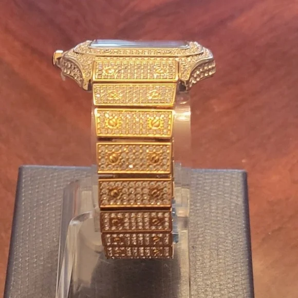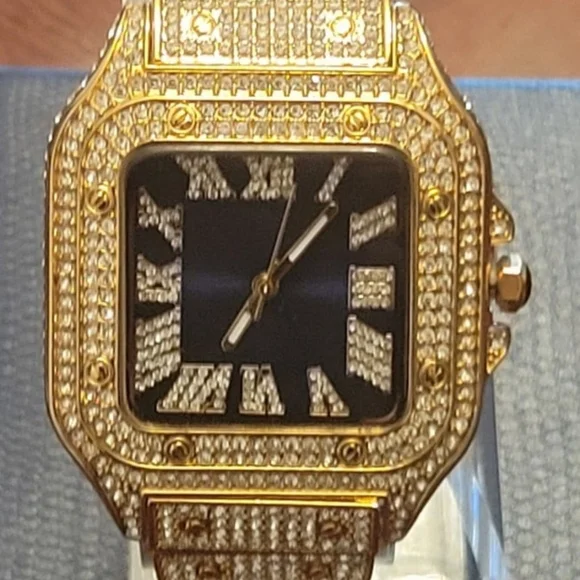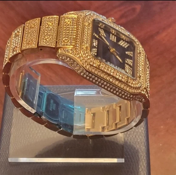 Brand new Gold-plated full Ice simated diamond bling luxury style watchFeature: Quartz movement for performance, accuracy, and precise time keeping Waterproof Rich navy blue face gives a regal look to this watch Stainless CaseStainless bracelet/bandRoman Numerals Nice quality design, polished and heavy weight.