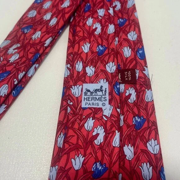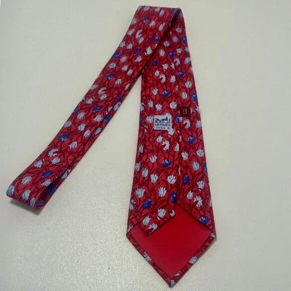 100% REAL HERMES TIE ~ RED w LIGHT & BRIGHT BLUE TULIPS