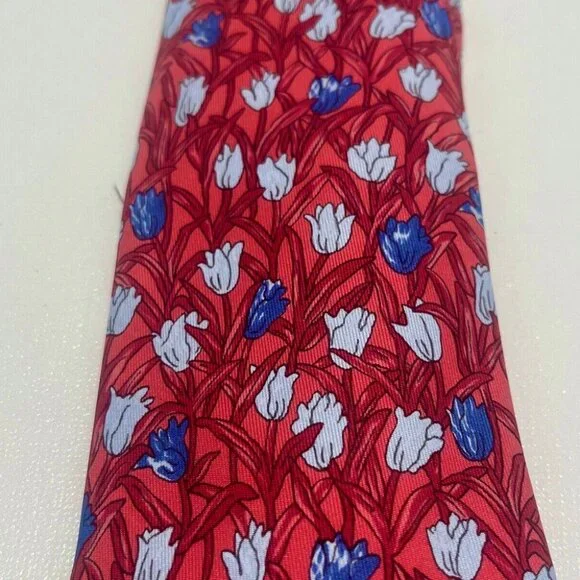 Color & Pattern:RED w LIGHT & BRIGHT BLUE TULIPSWidth: 3.45 inches at the widestLength: 58 inches longSerial number: 7449 HACondition: The tie is mint condition.It has been gently...