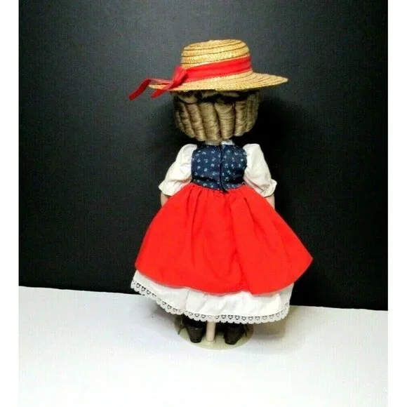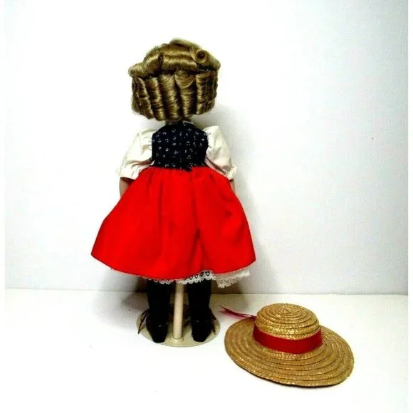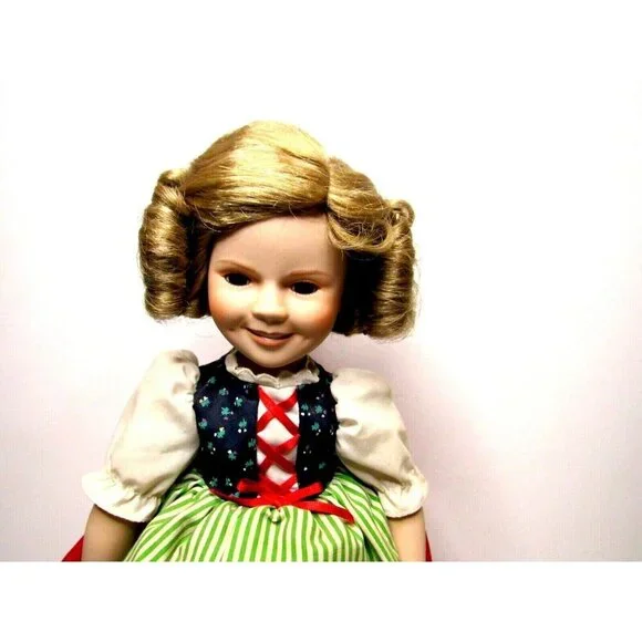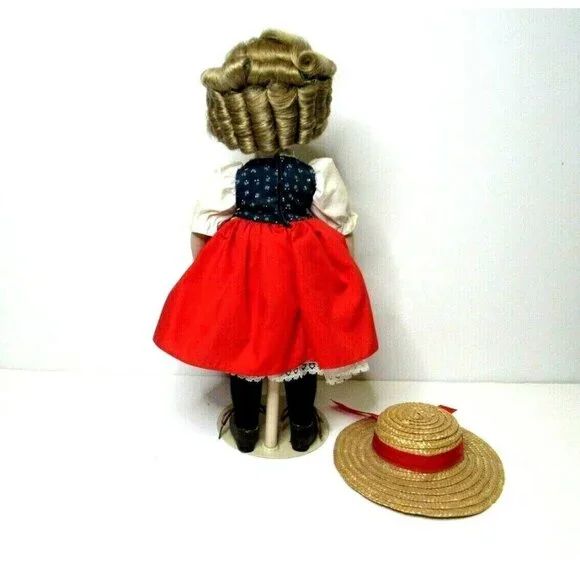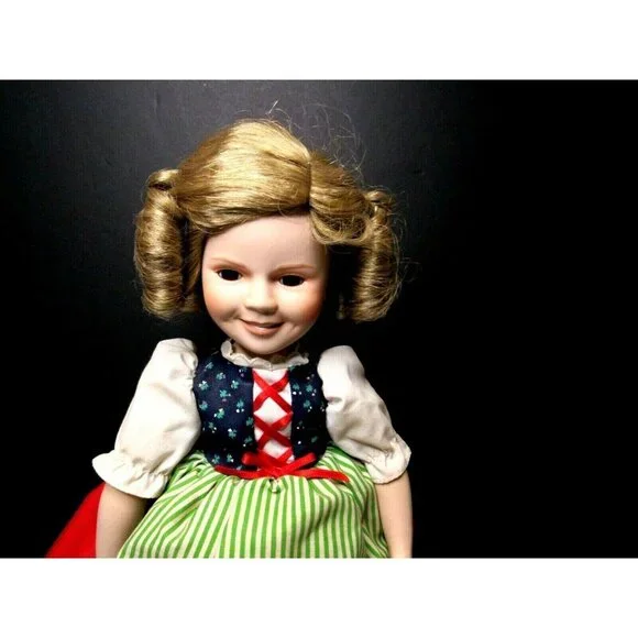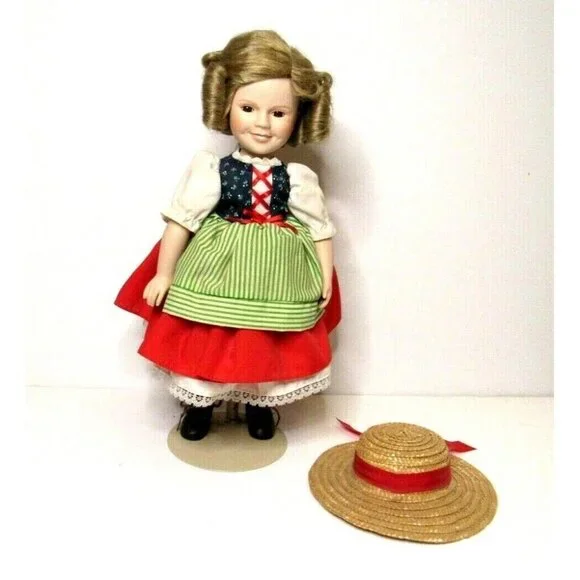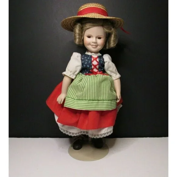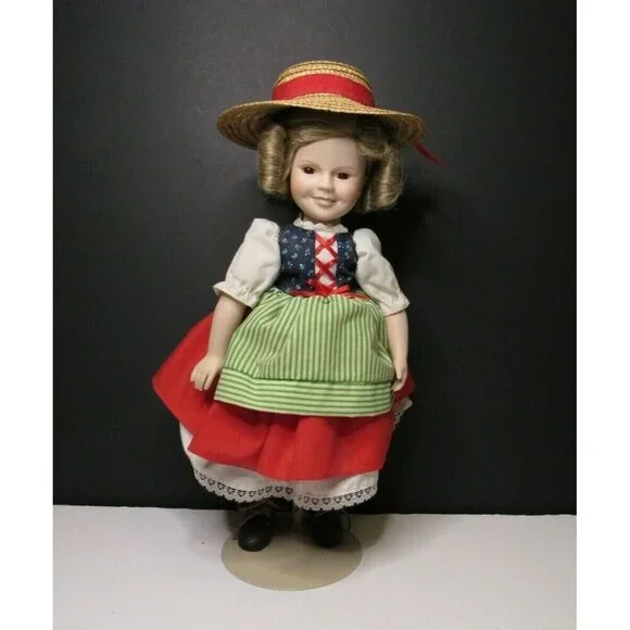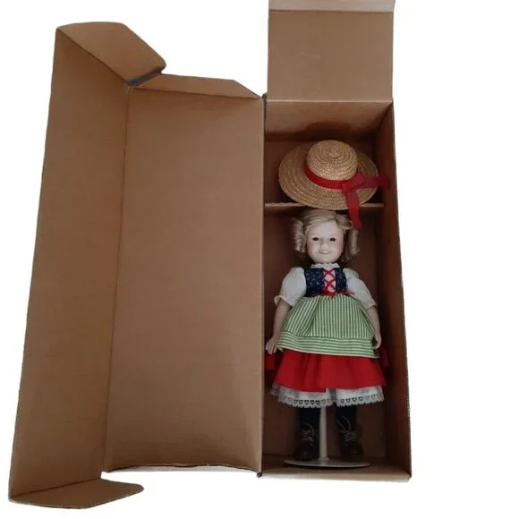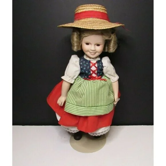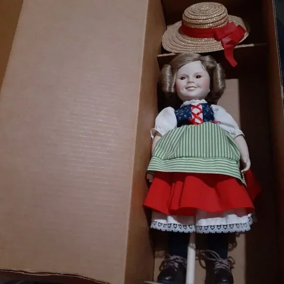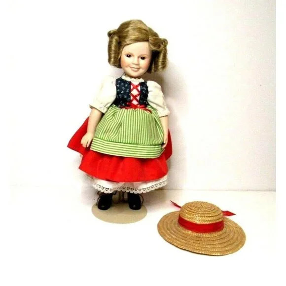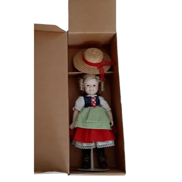 The Danbury Mint Heidi Shirley Temple Doll with Straw Hat and Stand In Box 13"Condition:She is from an estate and stood on a shelf on a stand.The ribbon on her hat has a tad of fading.She had some dust that I dusted off.Besides that she is in gorgeous condition.