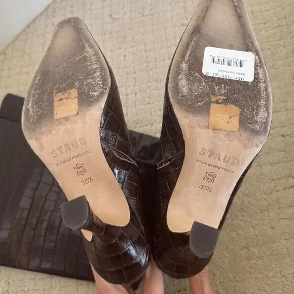 Elevate your style with these stunning Staud Cami croc-embossed tall boots in an elegant espresso brown color. Designed for the modern fashionista, these boots feature a sleek pointed toe, a striking 4-inch heel, and a luxurious croc-embossed leather finish. The perfect statement piece for any wardrobe, these size 35.5 (US 5.5) boots add sophistication to any outfit, from dresses to tailored pants.Key Features:Brand: StaudStyle Name: CamiSize: EU 35.5 (US 5.5)Color: Espresso (Deep Brown)Material: Croc-Embossed LeatherHeel Height: Approx. 4 inchesToe Shape: PointedShaft: TallCondition: Excellent pre-owned conditionAdd a touch of timeless elegance to your wardrobe with these Staud boots! Don’t miss your chance to own this iconic pair—bundle and save or send your best offer today!