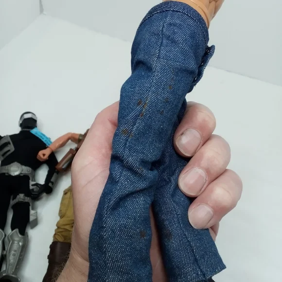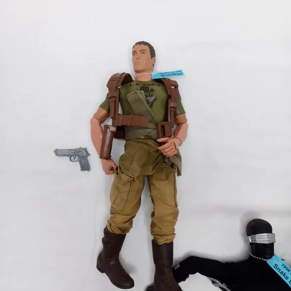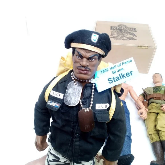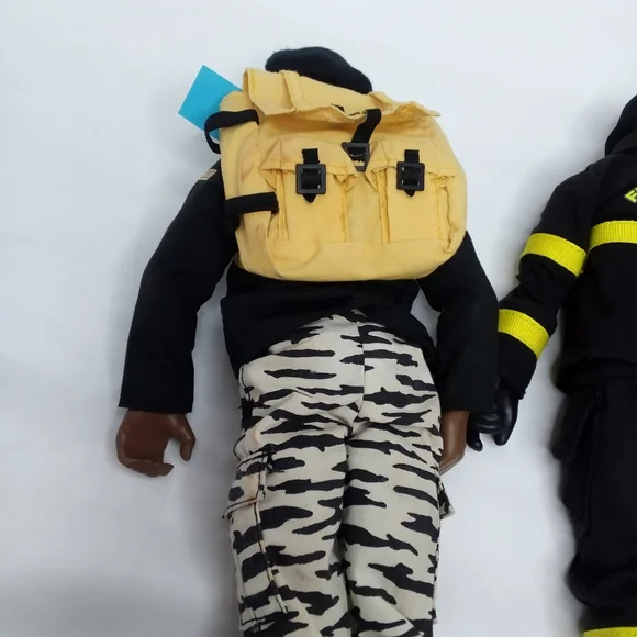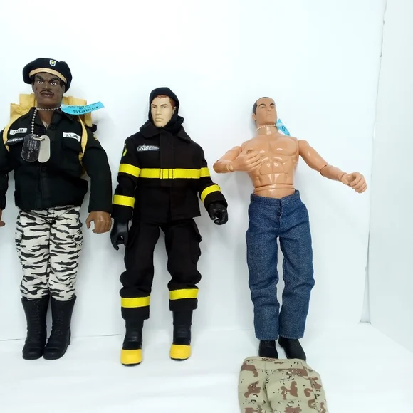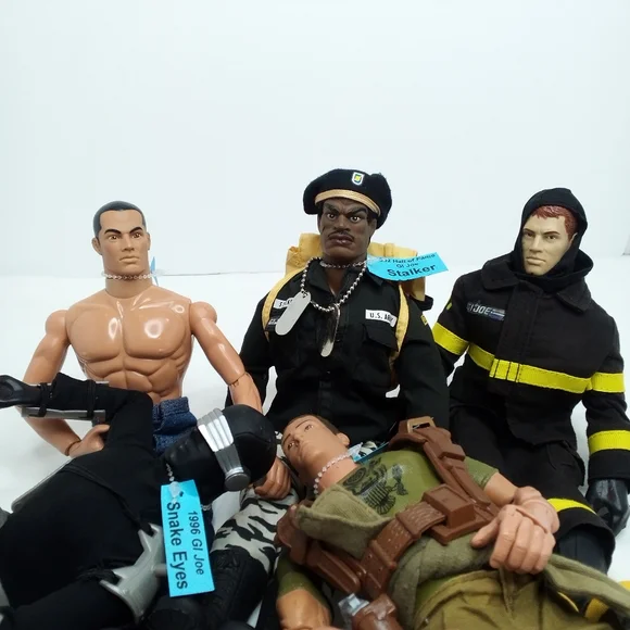 All Pawtucket. In good condition with wear on top of Snake Eyes Head and small spots of orange on Stalker and blue jeans of other figure. Ships next day.1992 Stalker-pants, jacket, boots, beret, backpack1996 Snake Eyes-body suit, 2 shin guards, 2 arm guards, utility belt, shoulder gaurds1996 Heroes Fireman-boots, overalls with head cover, gloves, GI Joe jacket1996 Soldier-boots, pants, waist tie, utility belt harness, gun(pistol)1996 GI Joe-NO shirt, boots, jeans, camo pants