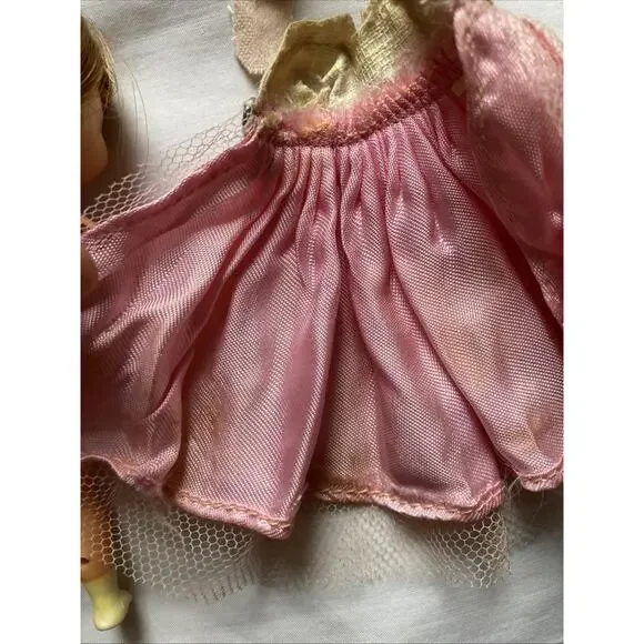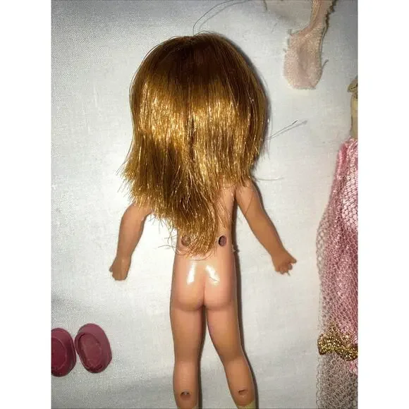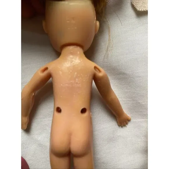 Very cute Tutti doll clone. Marked Hong Kong. There’s some yellowing to her body and some texture some areas of her torso. Her socks have yellowed with age. Some red has rubbed...