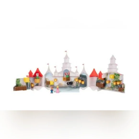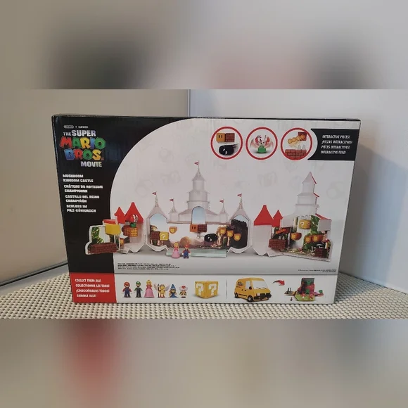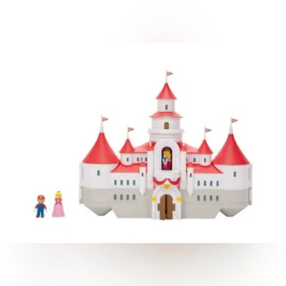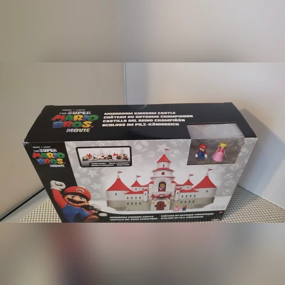 The Super Mario Bros. Movie Mushroom Kingdom Castle Playset with Mini Mario and Peach Action FiguresFigures approximately 1"Castle closed approximately 14x9x4"New, unopened Smoke/pet free