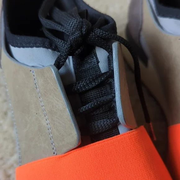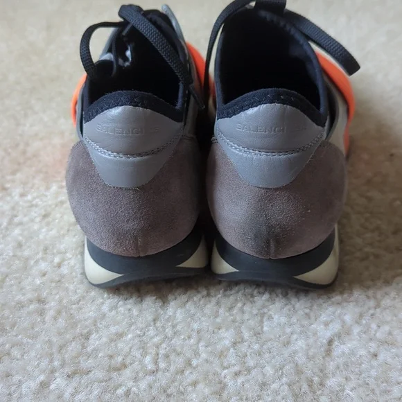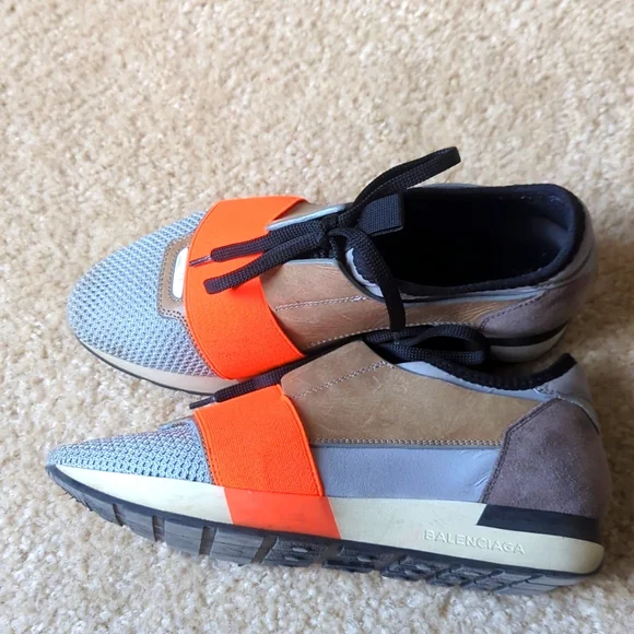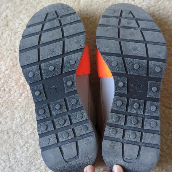 Balenciaga sneaker size 36. slip in style with orange accent band. Side and heel leather and suede accents. in good condition, some wear at the front toe part of one shoe. bottom...