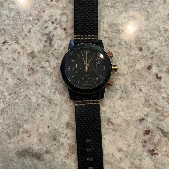 ELECTRIC California wristwatch FW02 Chronograph In excellent condition All black/copper AnalogMovement QuartzWoven polyester band Six brass hands Date indicator Mineral domed crystal face44 mm stainless steel housing Submersible up to 600 feetA heavy duty timepiece for the casual trekker of streets and trails, the Electric FW02 Watch incorporates sophisticated construction techniques and functional details with time-proven classic aesthetics. The 44 millimeter surgical stainless steel houses a Japanese quartz chronograph featuring six handsome brass hands accurately indicating time and date. The protective, raised construction can undergo nearly 600 feet of water pressure without leakage or damage. Electric manufactures this expression of the FW02 with a woven polyester band featuring contrast deco-style stitching.