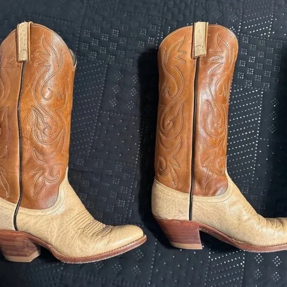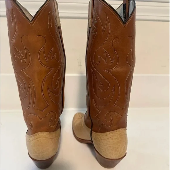Step out in style with these elegant brown and tan western boots. Perfect for any occasion, these boots offer both comfort and fashion. Used-excellent condition PRE-BAN rhino leather boots, size 6 1/2, no box