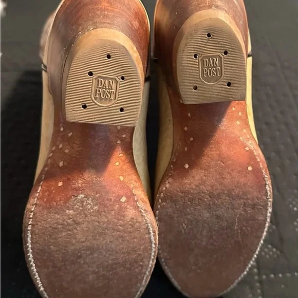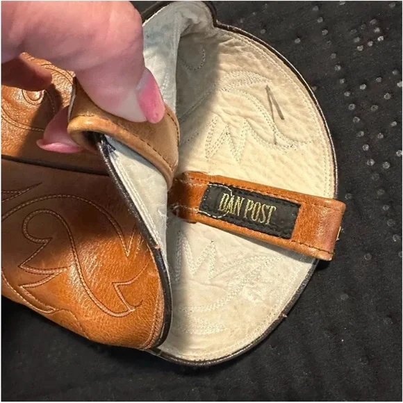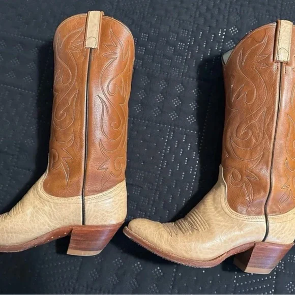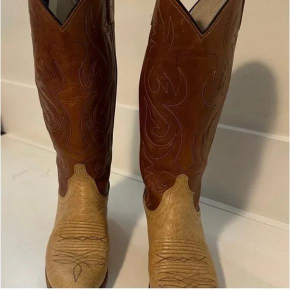 Step out in style with these elegant brown and tan western boots. Perfect for any occasion, these boots offer both comfort and fashion. Used-excellent condition PRE-BAN rhino...