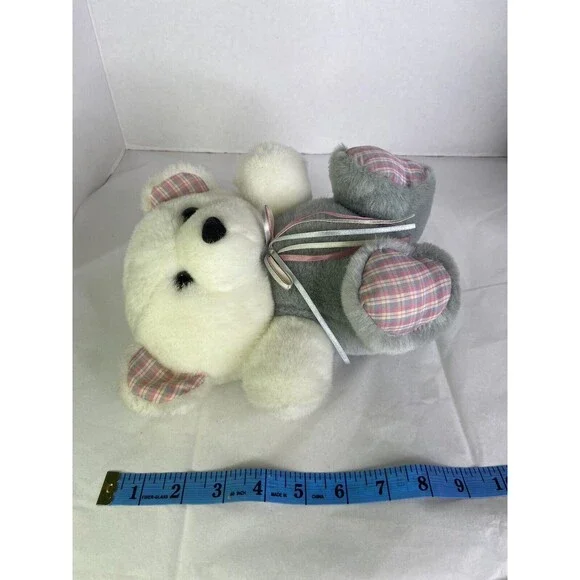 Vintage Dan Dee BEAR Gray White Pink Plaid Paws Ears Plush Stuffed Animal Toy