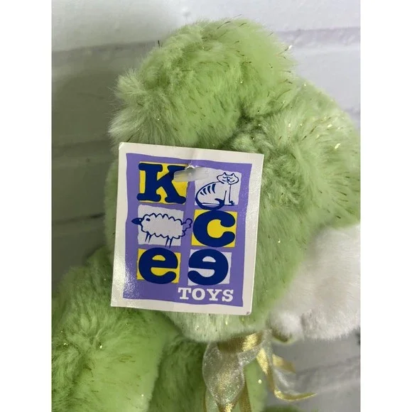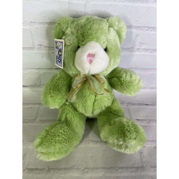Up for grabs is a brand new old stock Vintage KCEE toys Green Sparkle Speckle Gold With Bow Stuffed Animal Plush Teddy Bear. Will come EXACTLY as shown! Original tag shows some wear! Clean overall. No holes or tears. Measurements Laying flat are included in photos. Please refer to all photos. Ask any questions prior to purchasing. Thanks!