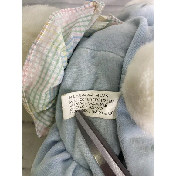 Up for grabs is a preowned Vintage Hugfun Bunny Rabbit Plush Stuffed Animal ToyWhite Blue Body Gingham Collar. Will come EXACTLY as shown! There are severalcosmetic and discoloration flaws noted throughout the body of the plush! Noholes or tears. The original tag is included but shows wear and age! SOLD AS IS!PLEASE DO NOT BID IF YOU ARE UNCOMFORTABLE WITH THE FLAWS! No other additionalaccessories or parts are included. Measurements laying flat are included inphotos. Please refer to all photos. Ask any questions prior to purchasing!Thanks!