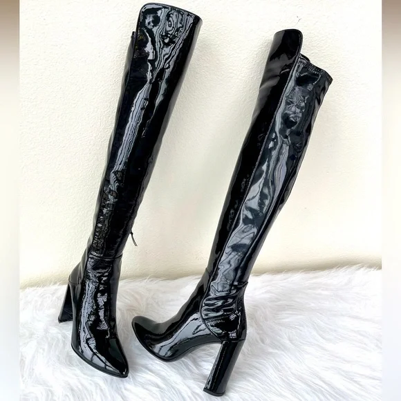 NWT! Stuart Weitzman Over-the-Knee Black Patent Leather Boots Size 39 Stunning boots - sophisticated style with a fun attitude.upper: leatherlining: leathersole: leather insole and solepointed toeblock heelpull on style -with inside 1/4 ankle zip Top Circumference 15”Heel 4”Height Overall 24” in back & 26” in frontShips in branded dust bags