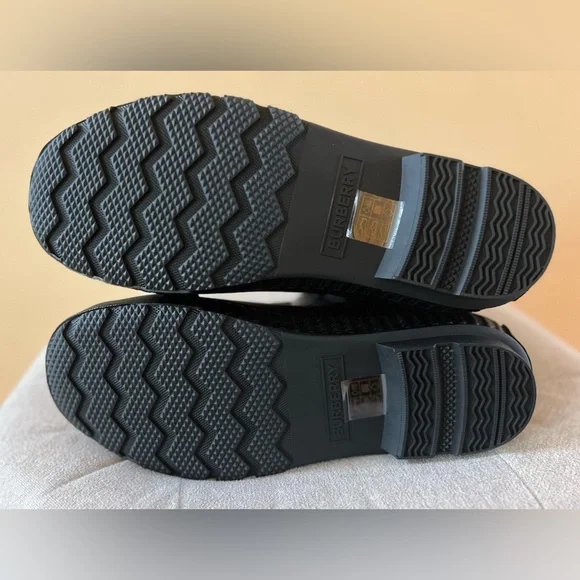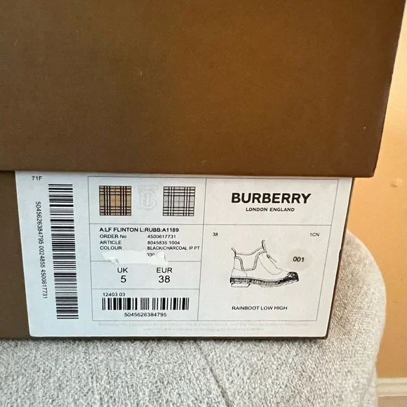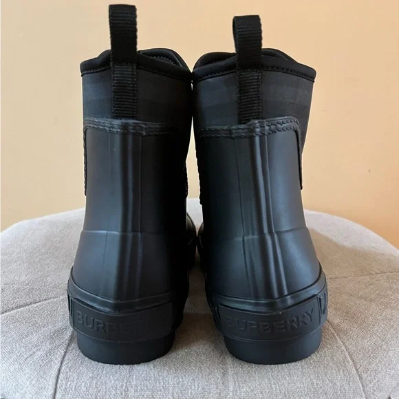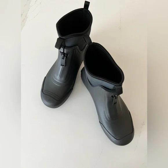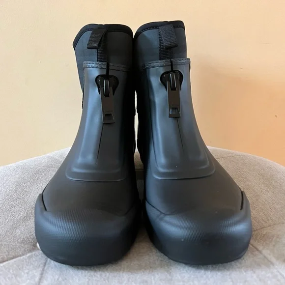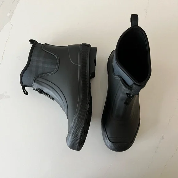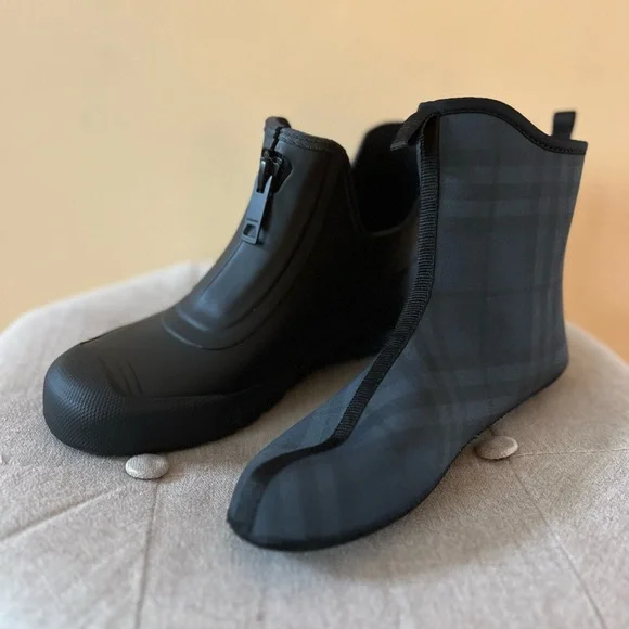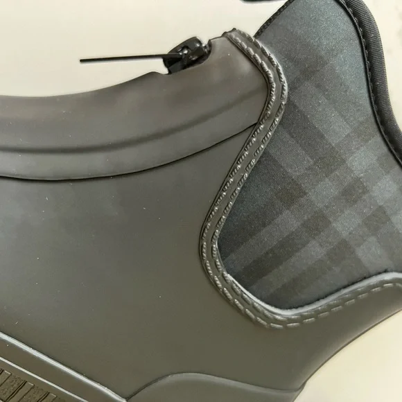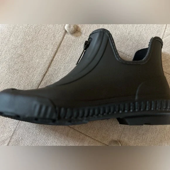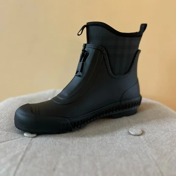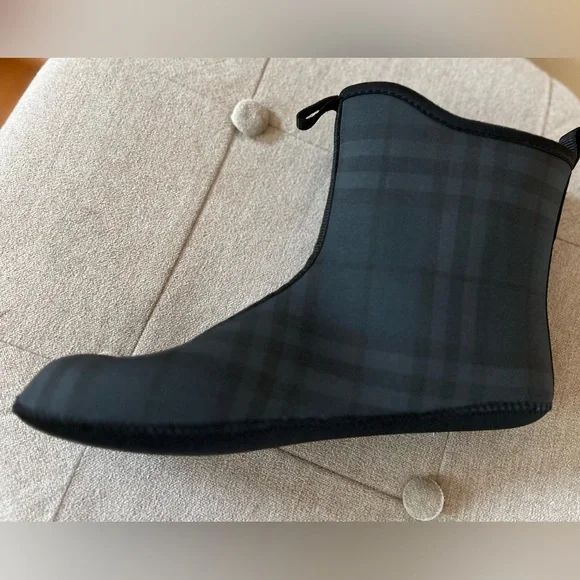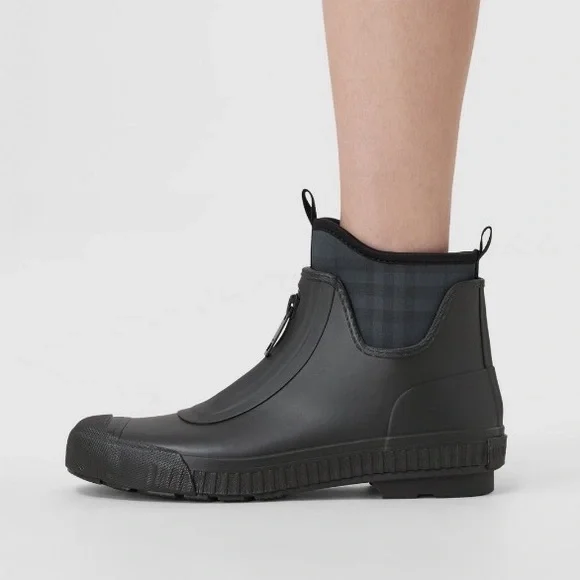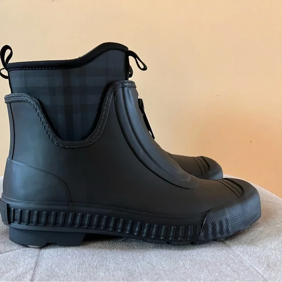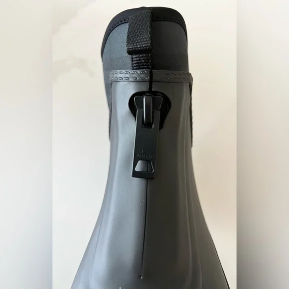 A rubber rain boot with a removable check neoprene sole and a decorative front zip. Upper: 70% rubber , 30% polyester Lining: 100% polyester Slip on style New with box