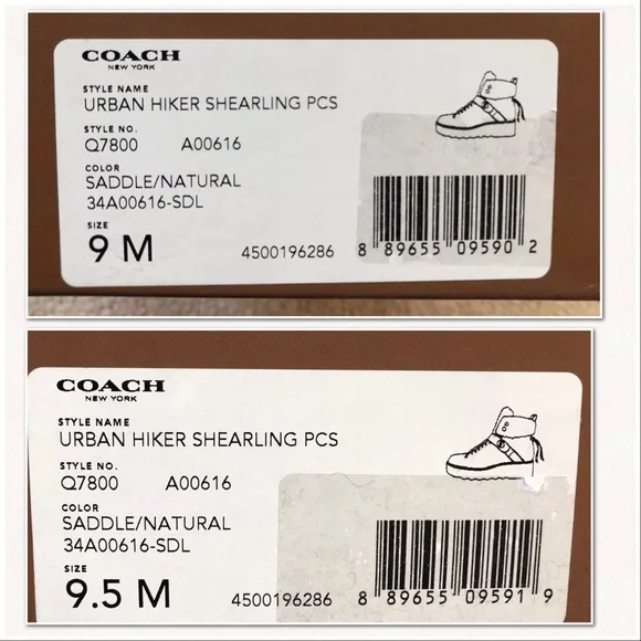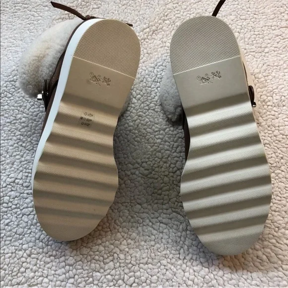 COACH URBAN HIKER Shearling Leather Platform Boots, Saddle/Natural. MSRP $375.New In BoxSizes: US Women´s 9.5Color: Saddle/Natural (Brown)Description:Trek the city in the Coach Urban Hiker.• Leather upper.• Strap with twist-lock closure.• Rounded toe.• Tongue made from dyed real sheep shearling.• Shearling origin: Australia.• Leather lining.• Lightly padded foot-bed.
