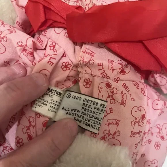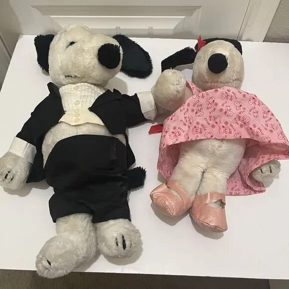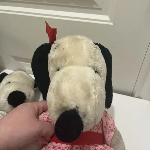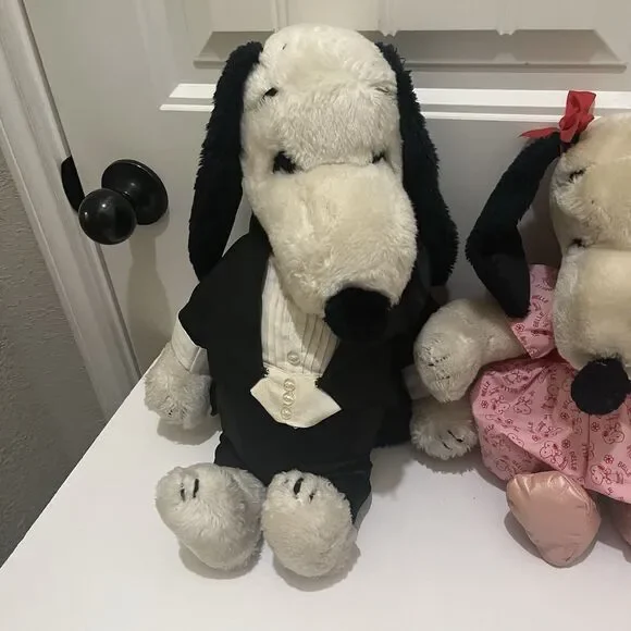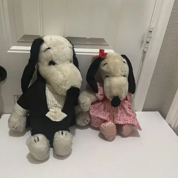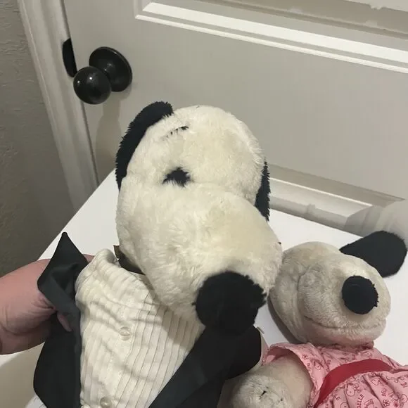 Vtg 1968 Snoopy Plush Tuxedo 20" and 16" Belle Girl Plush Pink Dress Dog LotPreowned, and there are signs of use, these plush are vintage, you will notice just normal signs of use, there are worn in areas on the plush fabric, and some discoloration or fading on the plush, and just normal wear on the clothes/shoes of plush, there is a hole on the armpit of the tuxedo and could be some more holes I have missed over on the clothes, see photos for conditionThanks for looking, please let me know if you have any questions