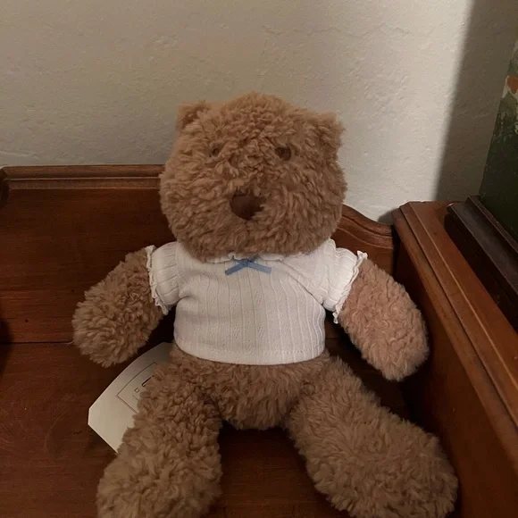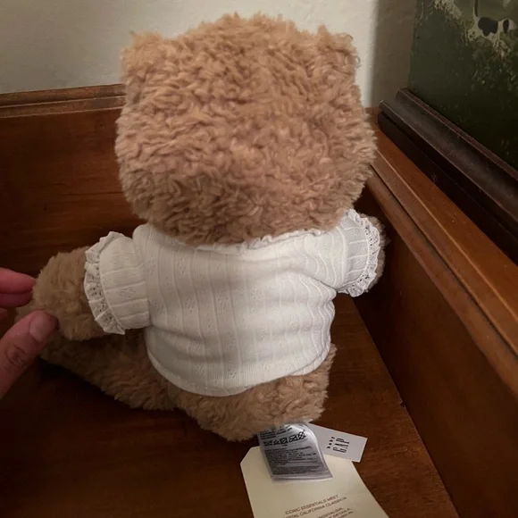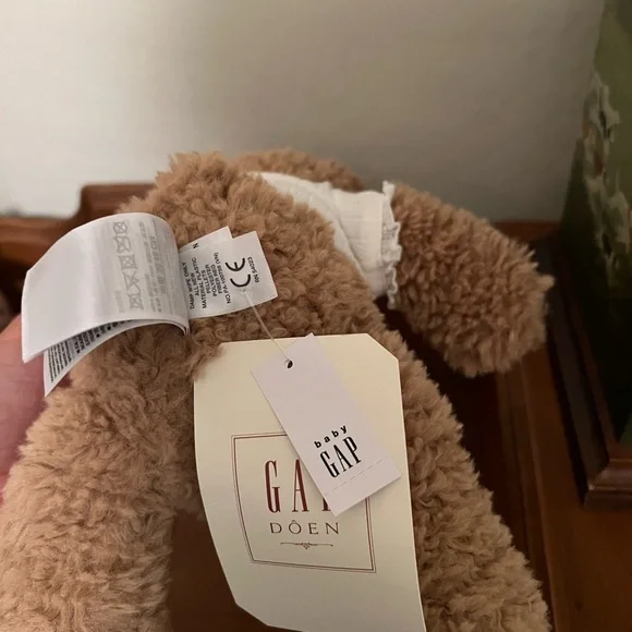 Soft tan teddy bear from GAP. Dressed in a white outfit. Ideal for snuggling. Used for nursery decor but I’m changing up the decor.