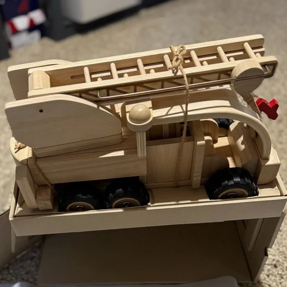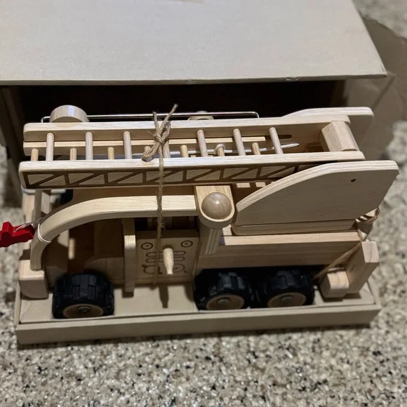 This wooden fire truck toy is perfect for imaginative play. Crafted with natural wood, it features a movable ladder and sturdy wheels. Ideal for young adventurers.New in box. Box is slightly damaged.