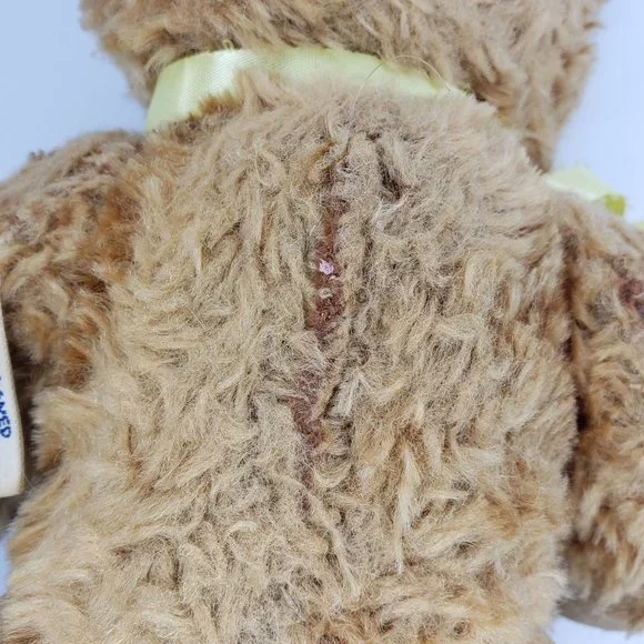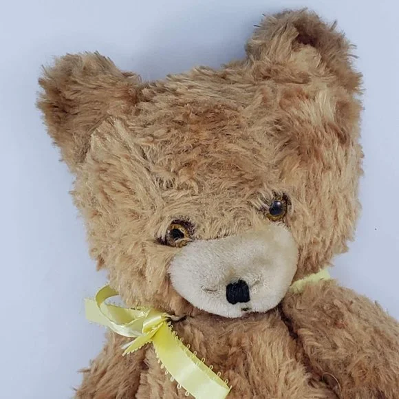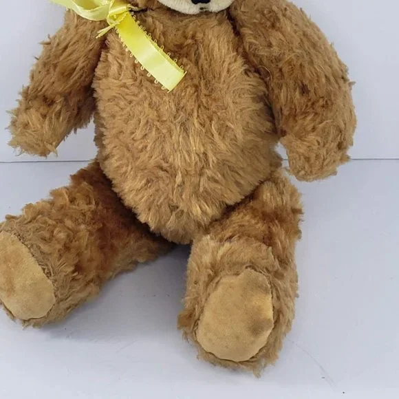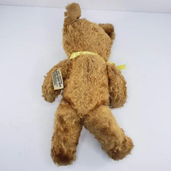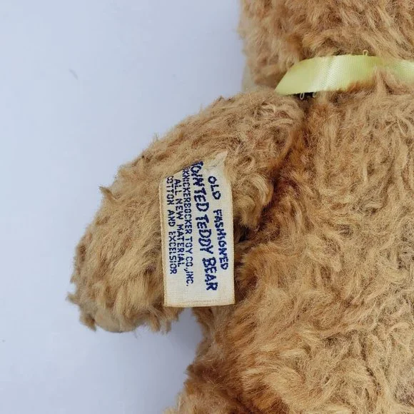 Vintage Knickerbocker Old Fashioned Jointed Teddy Bear Plush Stuffed AnimalIt is about 12" tall.Its legs, arms and head are movable.It has some staining or marks on one of its feet. He has a rough spot where he was sewed up on his back. It does smell dusty. See pictures.