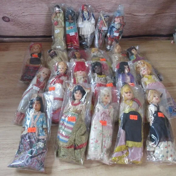 This collection features 21 vintage 6" to 8" Dolls of the World, each with unique costumes representing various cultures. Perfect for collectors or as a nostalgic gift.•...