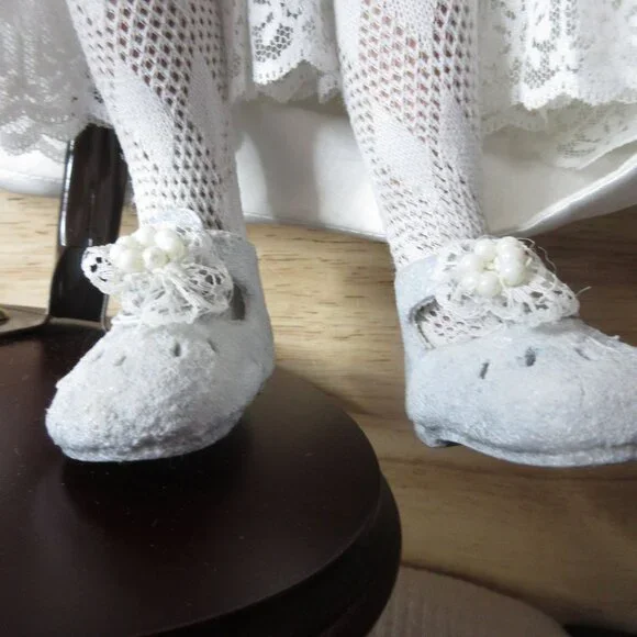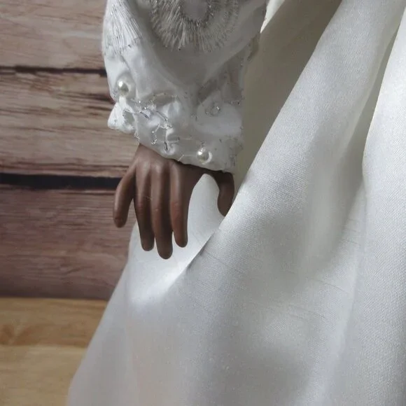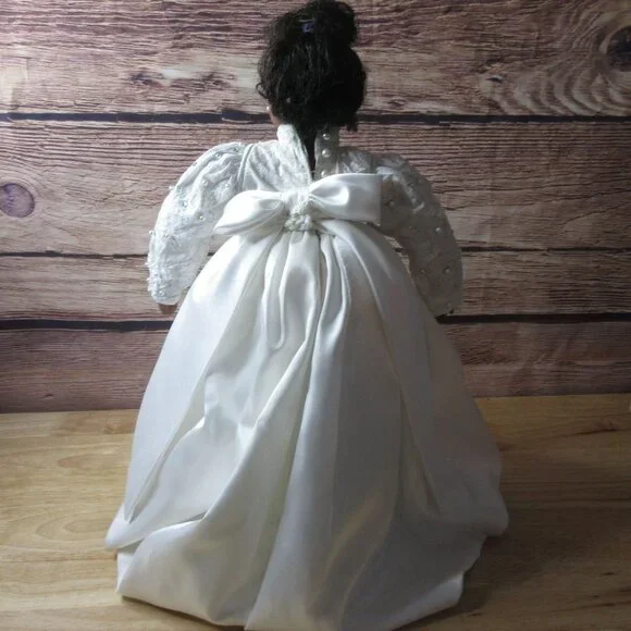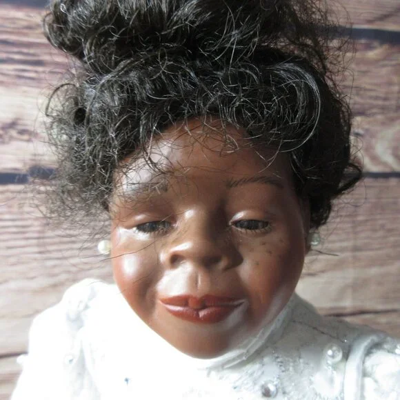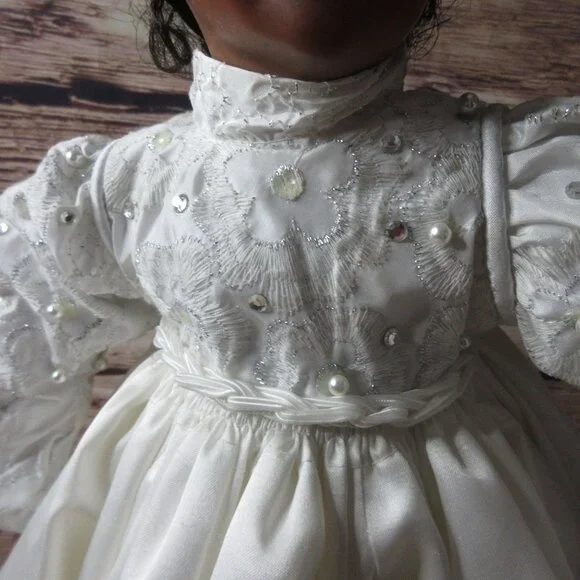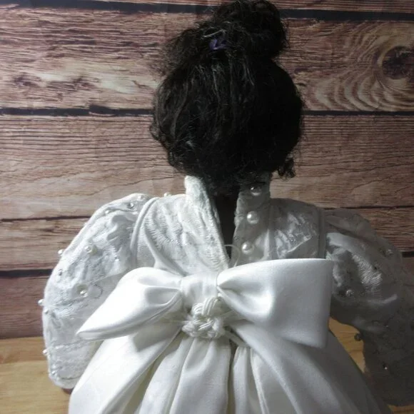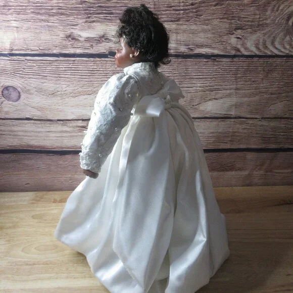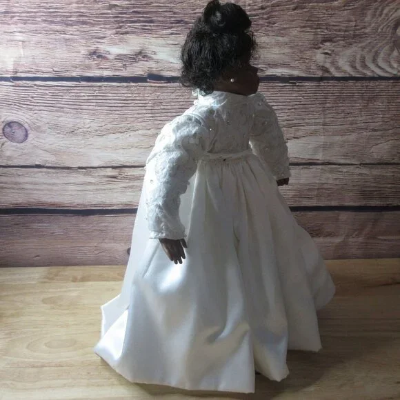 African American Porcelain 18" Bridal Doll Wistful face Inc Stand