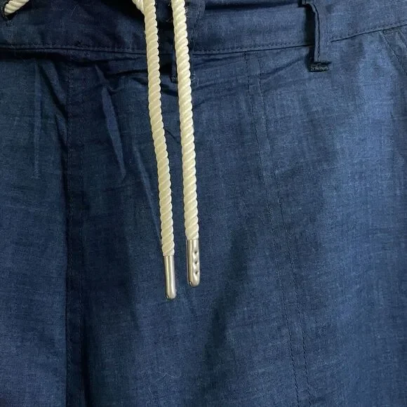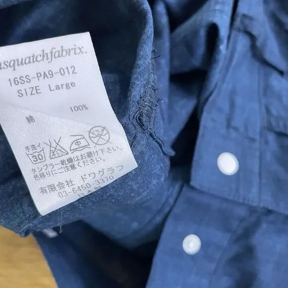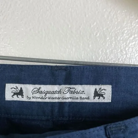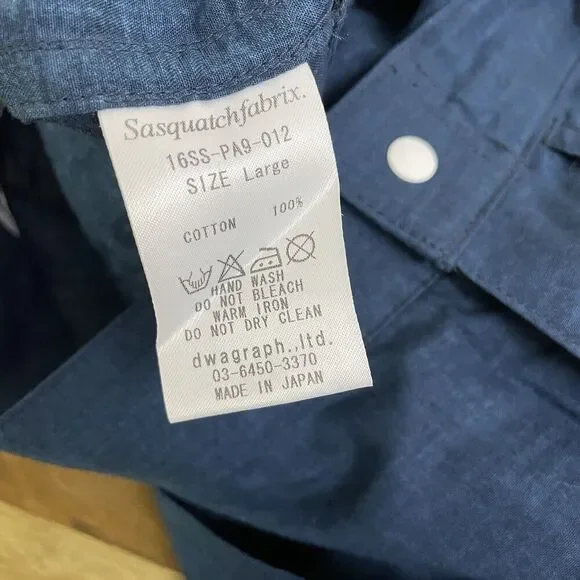 This listing is for a pair of Sasquatchfabrix Women´s Blue Wide Leg Pants. Adjustable waist (2 snap settings / drawstring at the front). Cotton. Made in Japan.condition, Very good pre-owned condition / a few light marks at the lower front cuff / darker mark at the interior cuffApprox MeasurementsTag Size, LargeWaist, 14.5in-16in (2 snap settings)Front Rise, 16inInseam, 27.5inLeg Opening, 9.5in