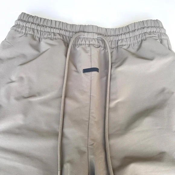 The Fear of God Athletics Relaxed Trouser is crafted in a heavy stretch woven fabric to contribute structure to a wide-leg silhouette with a soft, brushed interior. Functional details include an elastic waistband with drawcord, side seam pockets with perforated 4-way stretch lining, and a bottom hem with elastic bungee cord. Branding is defined by an adidas Fear of God logo on the leg and sueded black bar label on the center front. Color-ClaySize-L see size chart photo
