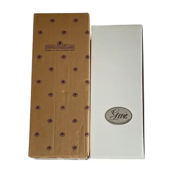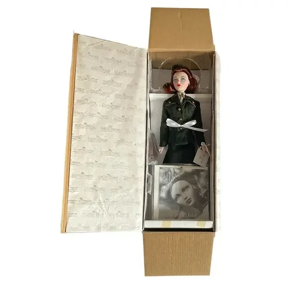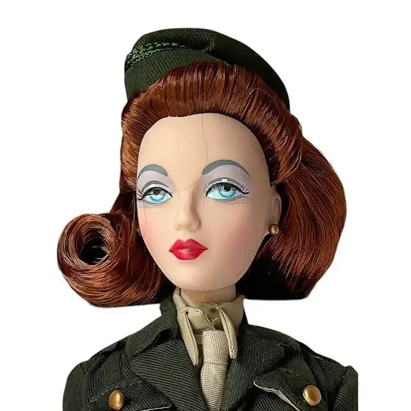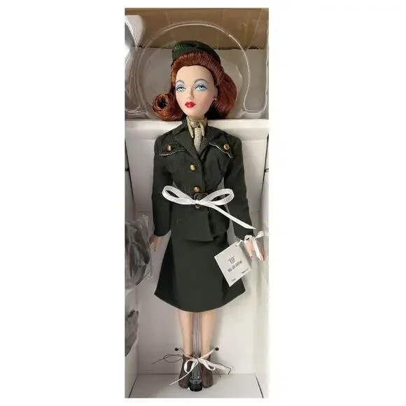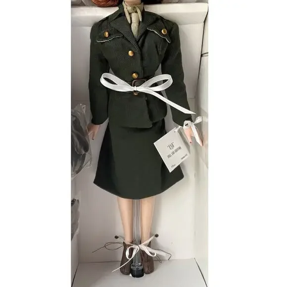 Ashton Drake Gene Marshall “USO” doll dressed in tailored dark green wool jacket with brass buttons down the front, skirt, belt & khaki long sleeve shirt with matching tie. Designed by Doug James in 1999, the outfit is inspired by the fashion of the mid-1940s. Includes earrings leather strap purse, wool garrison cap, house, hose, gloves, lace up brown boots, story card & COA. SKU# 76061 stockings. Limited edition 2231The doll has never removed from its box – it’s stilled tied in.he is wearing the earrings hat, hose & shoes. the purse & gloves are still sealed in plastic bags. The bag that contains the COA & story card has been opened. Will be sent in its original shipper box that shows some wear from previous shipments. Consider the pictures to be part of the description. Don´t hesitate to ask any questions.