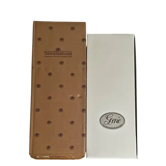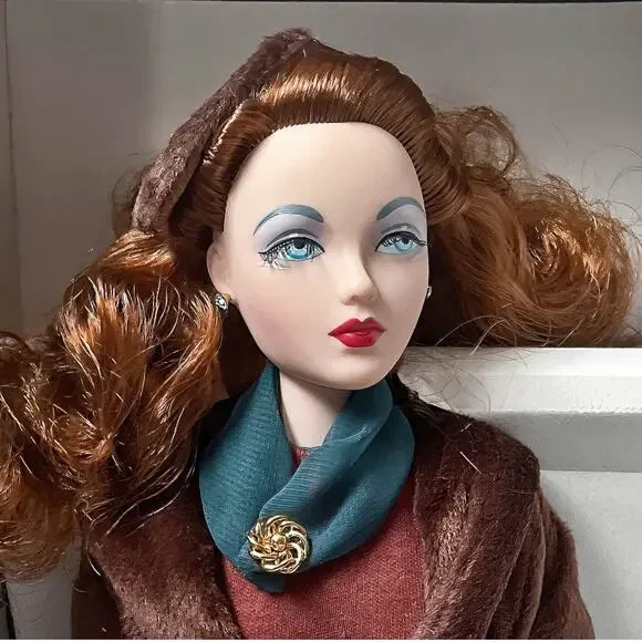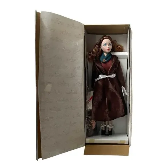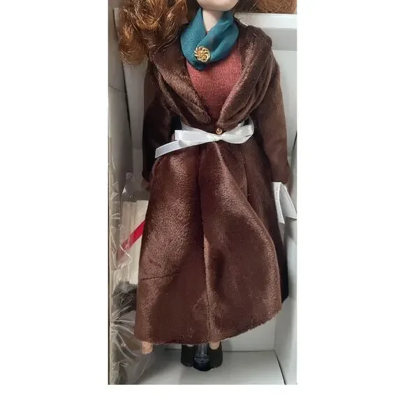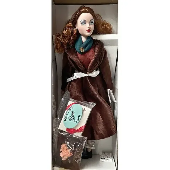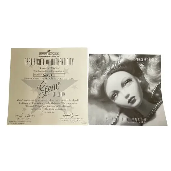 Ashton Drake Gene Marshall “Warmest Wishes” doll dressed in a rust-colored knit dress, toasty warm brown taffeta lined winter coat with wide collar & teal chiffon cowl scarf. Desgned by Tim Kennedy in 1998, the outfit is inspired by the fashion of the late y 1940’s. She is a an F.A.O. Schwarz exclusive. Includes dress, coat, twist cap, matching muff, toy soldier in gift box, golden scarf brooch, shoes, hose “aquamarine” earrings, doll stand, story card & COA. SKU #94663. Limited edition #S07803.The doll has never removed from its box – it’s stilled tied in. She is wearing the earrings, scarf, brooch, hat, hose & shoes. The muff & gift box are still sealed in plastic bags. The bag that contains the COA & story card has been opened & is loose in the box. Will be sent in its original shipper box that & shows wear from previous shipments. Consider the pictures to be part of the description. Don´t hesitate to ask any questions.