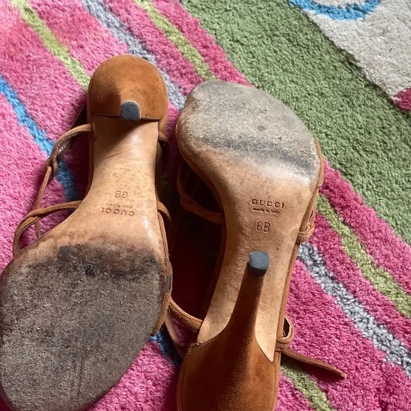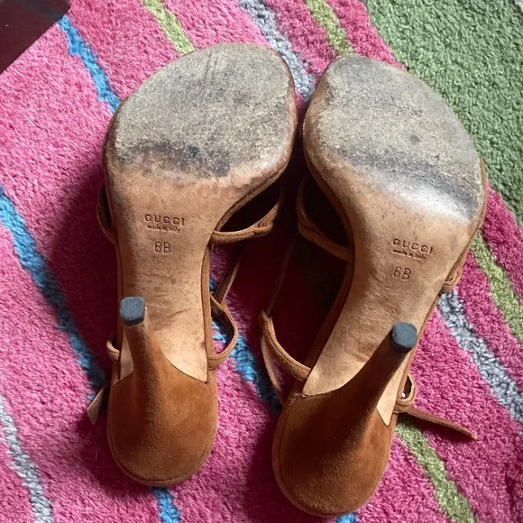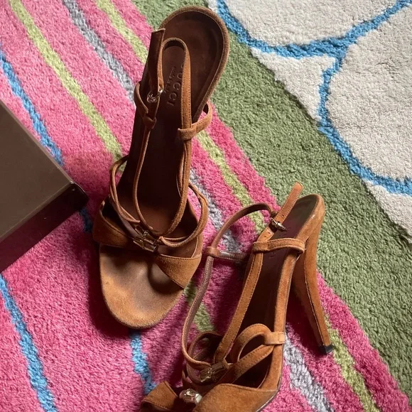sz 6 tobacco color suede sandal w gold hardware