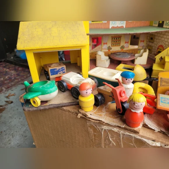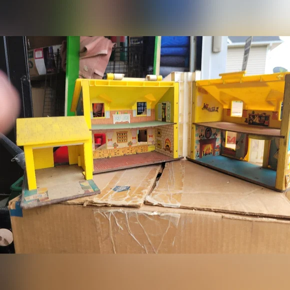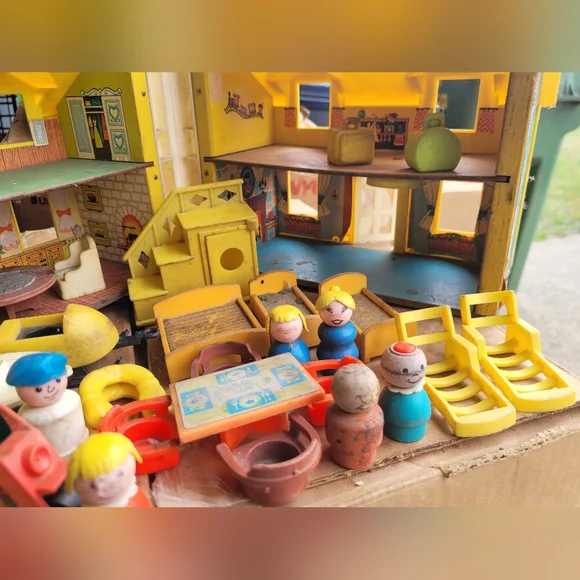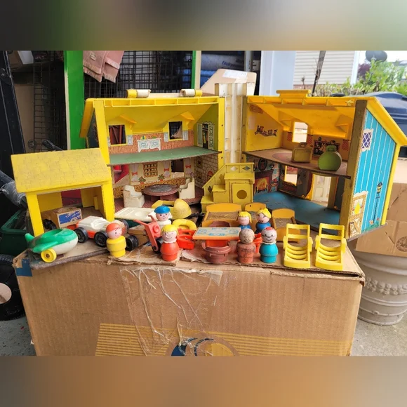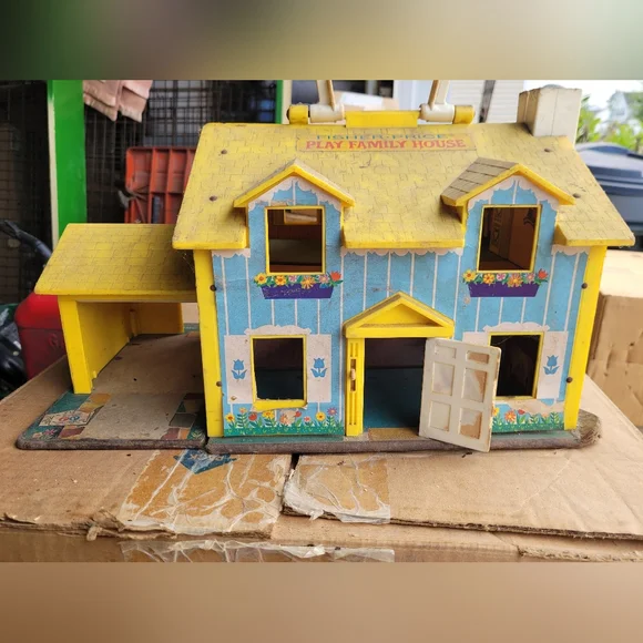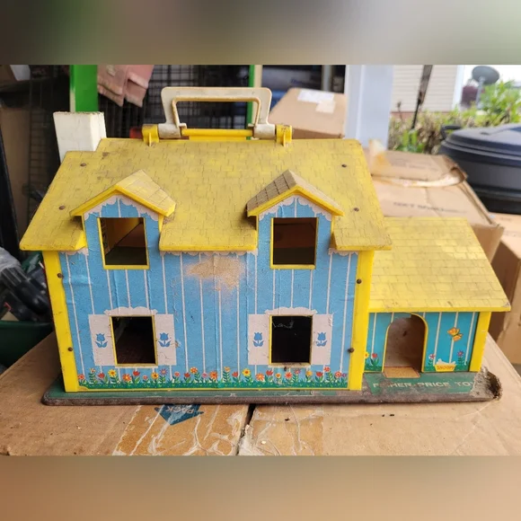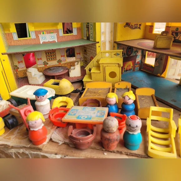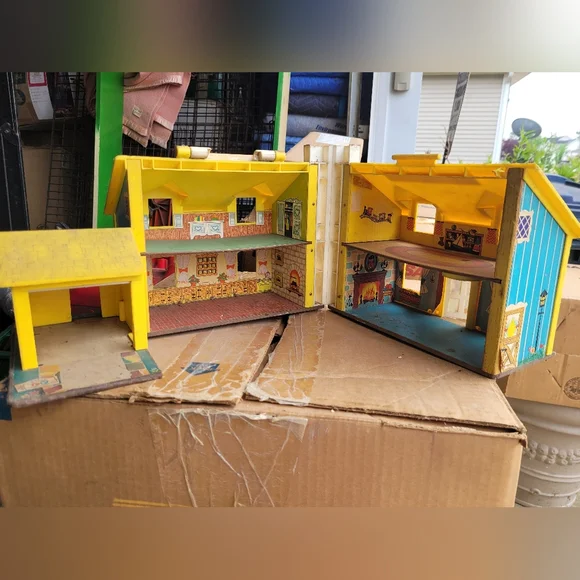 Charming Fisher-Price Play Family House. Features vibrant yellow and blue colors. Perfect for imaginative play.This set is from the 60´s and needs a good cleaning.