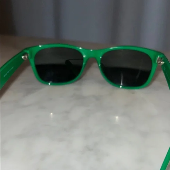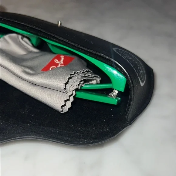 Stylish and durable, these Ray-Ban sunglasses feature a vibrant green frame and mirrored silver. Perfect for sunny days, they offer both protection and style. Black ray-ban leather case and gray cleaning cloth included.