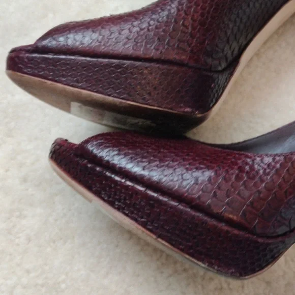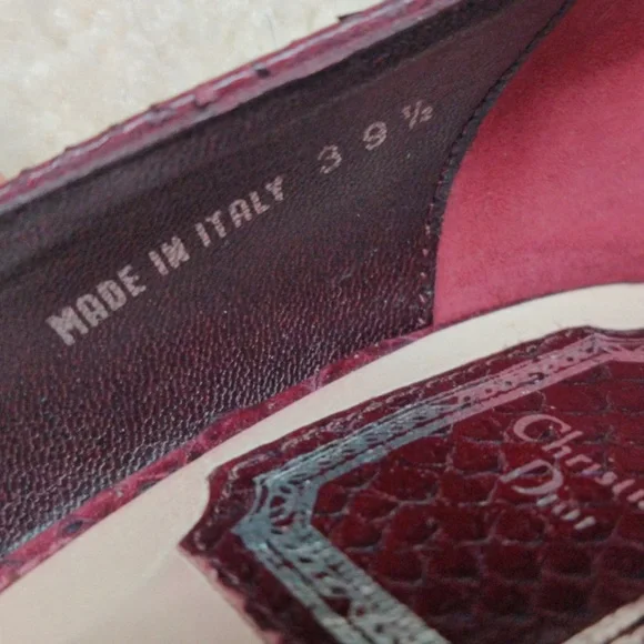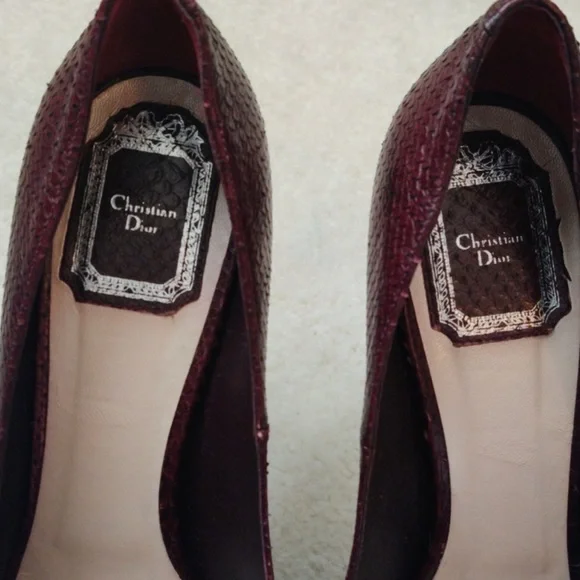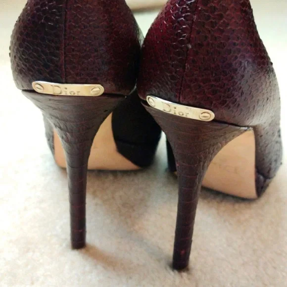 CHRISTIAN DIOR pumps come in purple snake skinleather with a peep toe, platform, and covered stilettoheel. Made in Italy.Approximate Measurements1" platformStiletto Heel 4"Dior pumps run 1/2 size small, IT size 39.5, fits 8.5-9US bestGently Used- This item is in good condition aside fromvisible signs of use on sole and minor crease marks on theinsole.