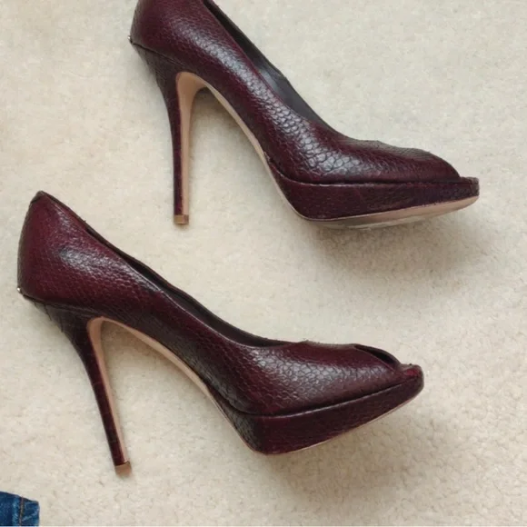 CHRISTIAN DIOR pumps come in purple snake skinleather with a peep toe, platform, and covered stilettoheel. Made in Italy.Approximate Measurements1" platformStiletto Heel 4"Dior...