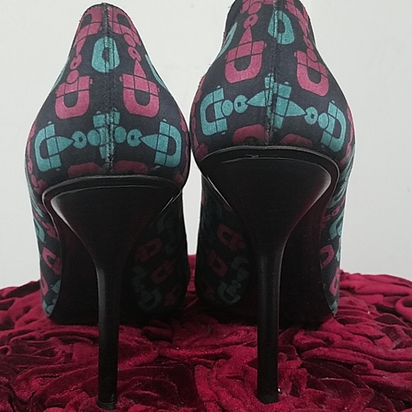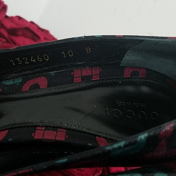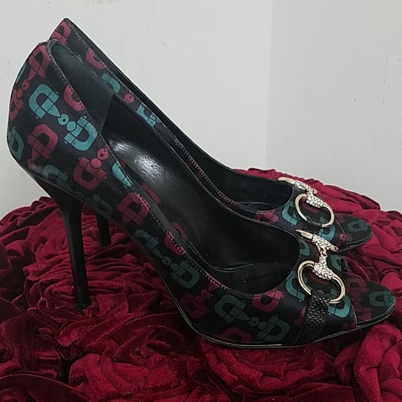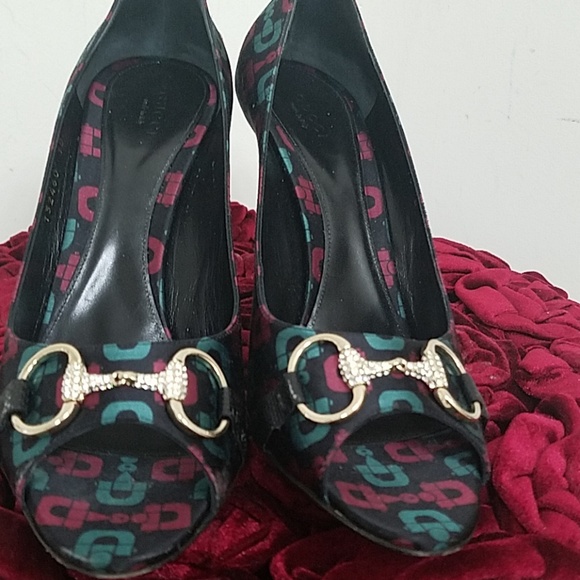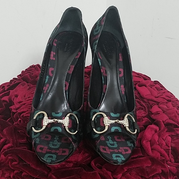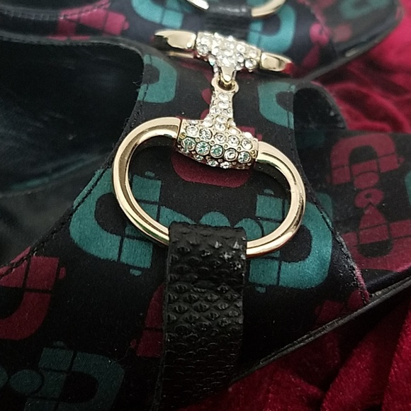 Satin with leather trim and gold crystal horse bit 3" heels serial tag 132460 made in Italy super cute and sexyhoresbits in signature colors green and deep red size 10
