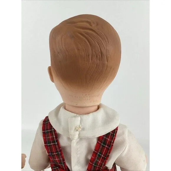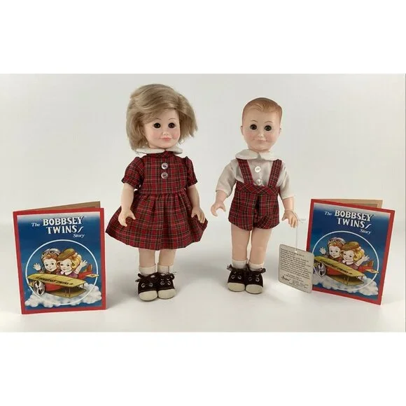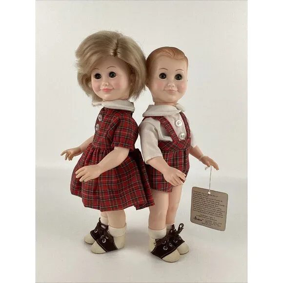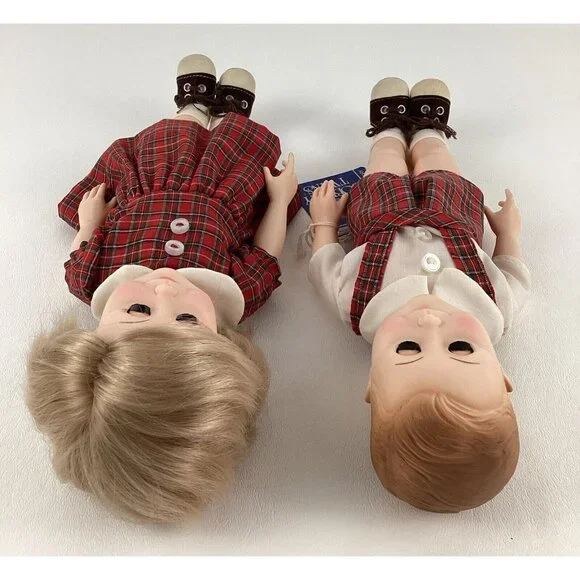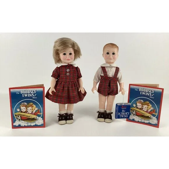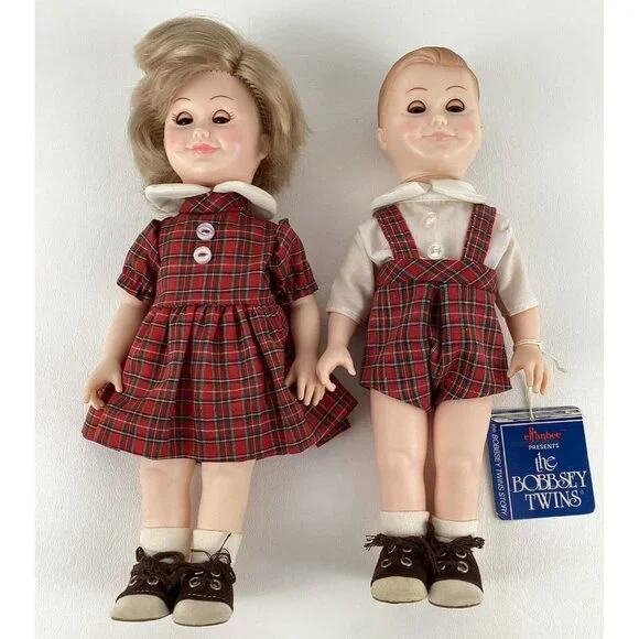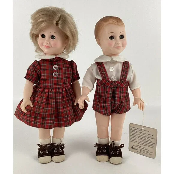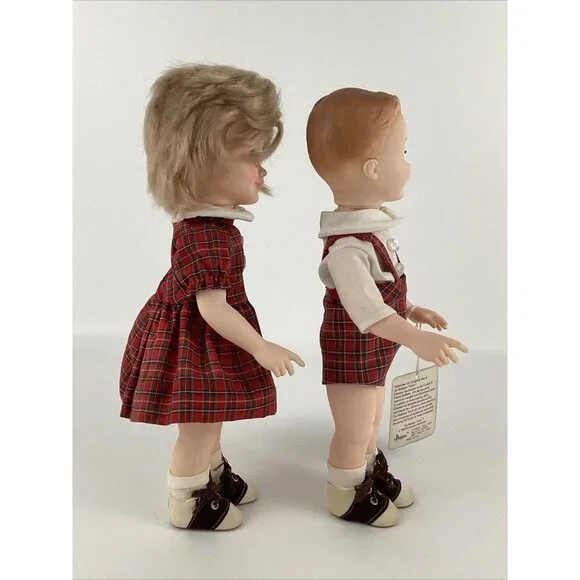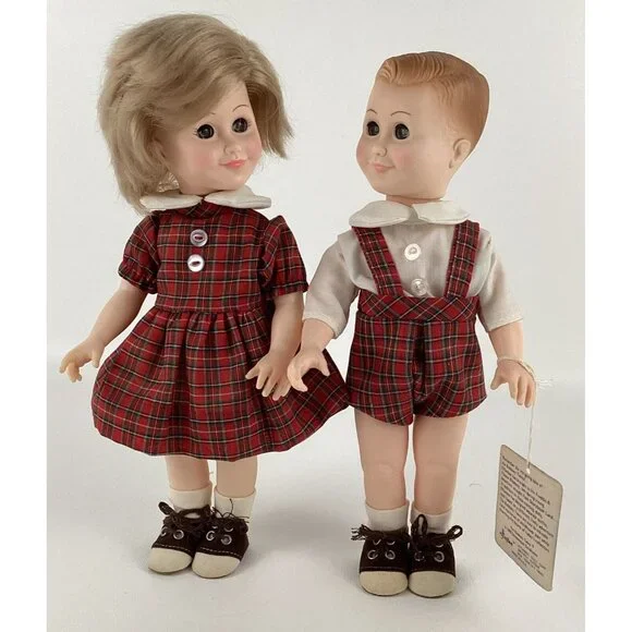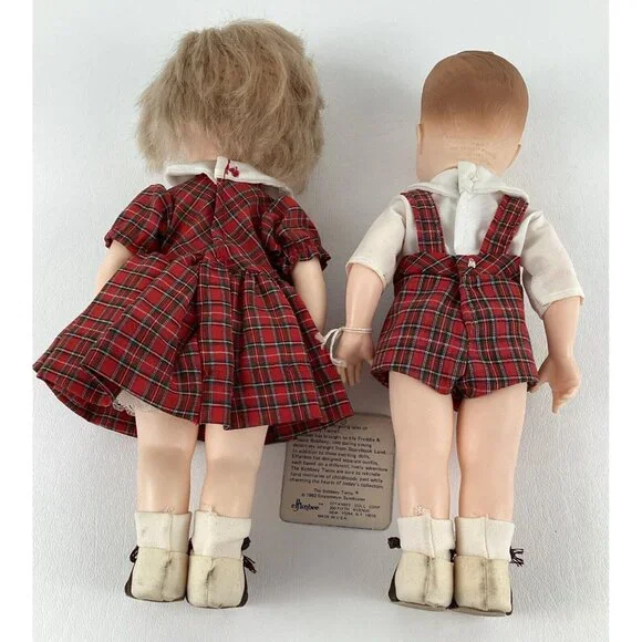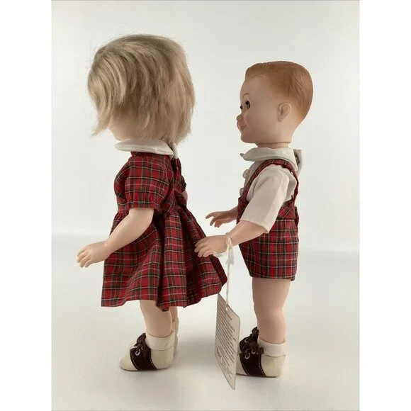 Vintage preowned condition, some marks on back of shoes. No original boxes. Have hand tag & paperwork. This vintage Effanbee Bobbsey Twins doll set includes Flossie and Freddie, dressed in a red plaid outfit. The dolls have wavy blonde hair, blue open / close eyes, and a light complexion. They are 11 inches in size and were manufactured in 1982 in the United States. The set is an original, not a licensed reproduction, and comes without packaging. The dolls are part of the Bobbsey Twins franchise and are perfect for collectors or fans of the series. Made of vinyl material.