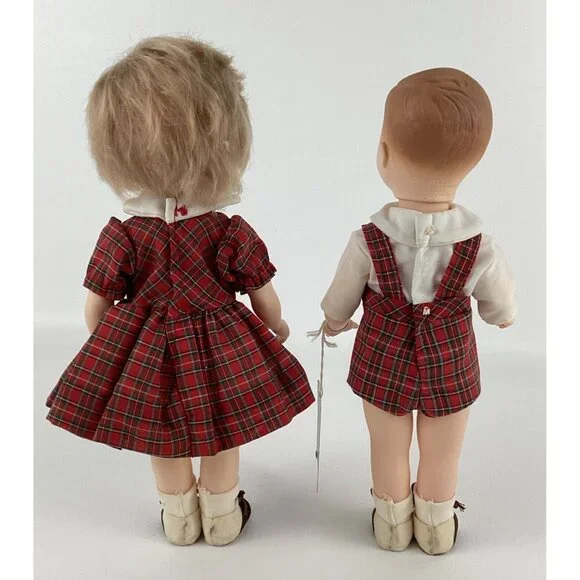 Vintage Effanbee Bobbsey Twins Dolls 11" Flossie & Freddie Red Plaid 1982 Tags