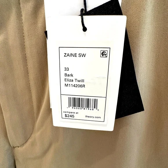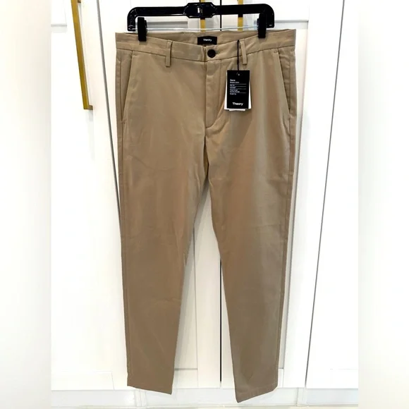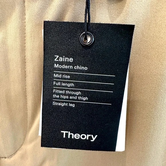 Brand new with tags. 100% AuthenticTheory Zaine Modern Chino PantsSize 33”Color- BarkHave a comfortable day without compromising style with these flat-front pants.Features• Belt loops• Button closure• Zip fly• Side slip pockets• Back welt pockets• Cotton, polyester & elastane• Machine washComes exactly as shown in photos. Retail &245 plus tax.