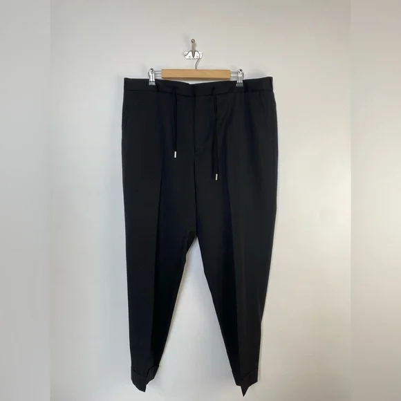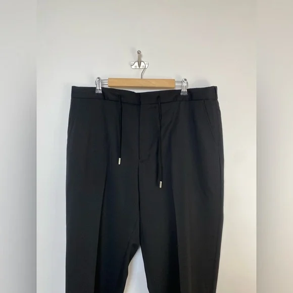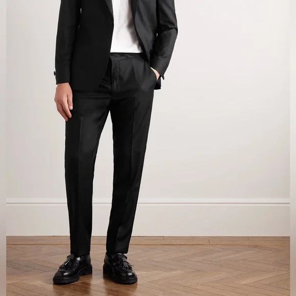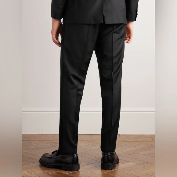 DESIGNED BY MR PORTER. Mr P.´s tuxedo trousers are a classic choice for formal occasions. Tailored from pure virgin wool, they´re cut with straight legs and topped with an adjustable drawstring waistband. Wear yours with a black jacket from our edit.This product is part of Mr P.’s PERMANENT collection - a range of premium everyday staples designed to form the foundation of the modern man’s wardrobe.Fits true to size. Take your normal sizeSlim-tapered leg, mid-rise trousersDrawcord at the waistMid-weight, non-stretchy fabricBlack virgin woolDrawstring waistband, two on-seam pockets, two back buttoned welt pockets, pressed creases100% virgin woolHook and zip fastening**Navy Style also available in my closet, bundle and send me an offer! Size 40Approximate Measurements taken flat: Waist:20.5”Rise:12”Inseam: 29”Excellent Condition. These have been tailored to cuffed hem position.