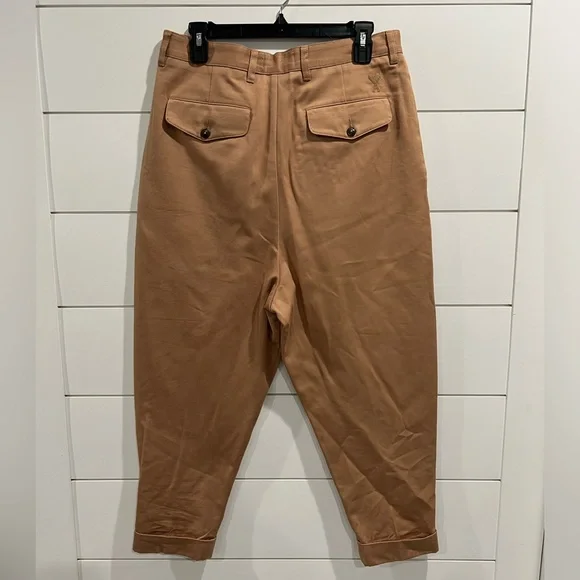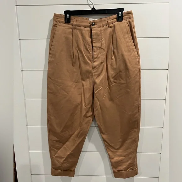 100% cotton Oversized Carrot Fit Trousers. Featuring a waistband with belt loops, a concealed front fastening, side seam pockets, rear welt pockets, a loose fit and a turned up hem.Tonal embroidered logo at back waistband. Pleats at front. Central creases at back. Rolled cuffs. Button-fly. Brown hardware.NWOT- never wornSize small
