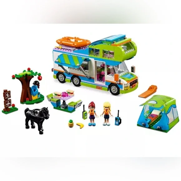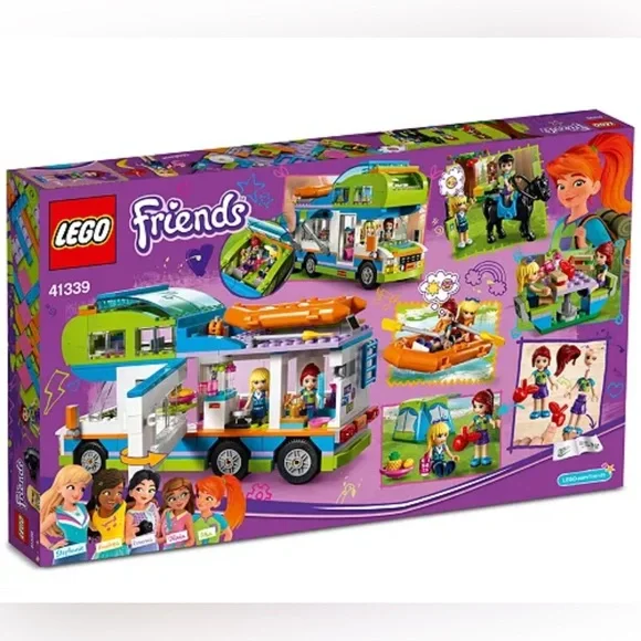 ® Friends 41339 Mia’s Camper Van makes camping with friends a dream! Lift off the roof of this cool playset for easy access to the kitchen and bathroom inside, flip open the lid of the upstairs sleeping area, put up the canopy and get to work on the tent with 2 beds inside. There´s also a picnic table, an inflatable dinghy and a friendly horse for endless outdoor adventures! Includes 2 mini-dolls and a horse figure.Includes Mia and Stephanie mini-doll figures, plus an Aria the horse figure.