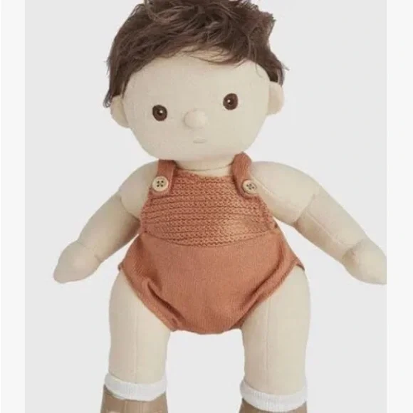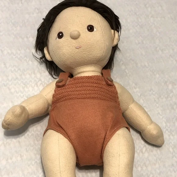 Olli Ella Dinkum Doll, Peanut - Preloved, yet in near excellent condition, This collectible Doll can sit and stand while in shoes. This delight doll is made of 100% cotton- Body is 14” - interior stiffing is hypo- allergenic poly fill - shoes: BPA/ free PVC- Romper is itch free acrylic yarn. All working body parts - No box. Smoke free home.