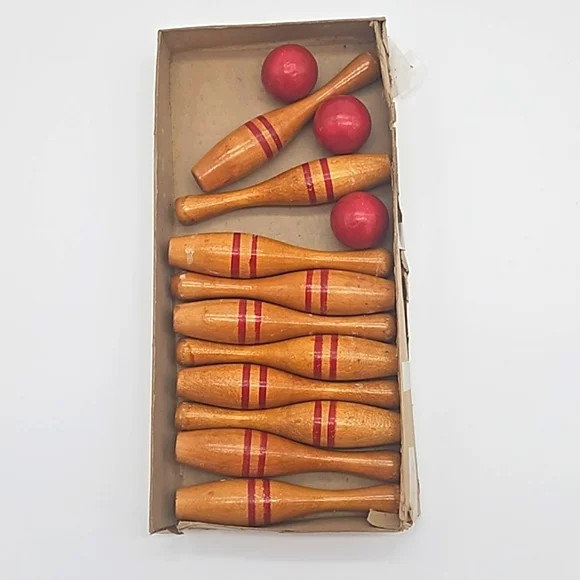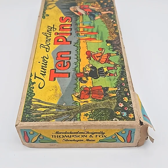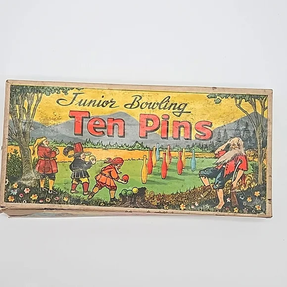 Vintage 1930-1940s Junior Bowling Ten Pins game. All pins and balls are present. Pins and balls are wooden. Box is worn from age and torn in one corner. A fun and high quality antique game!New to ? Save $10 when you sign up using invite code MANDERSON738