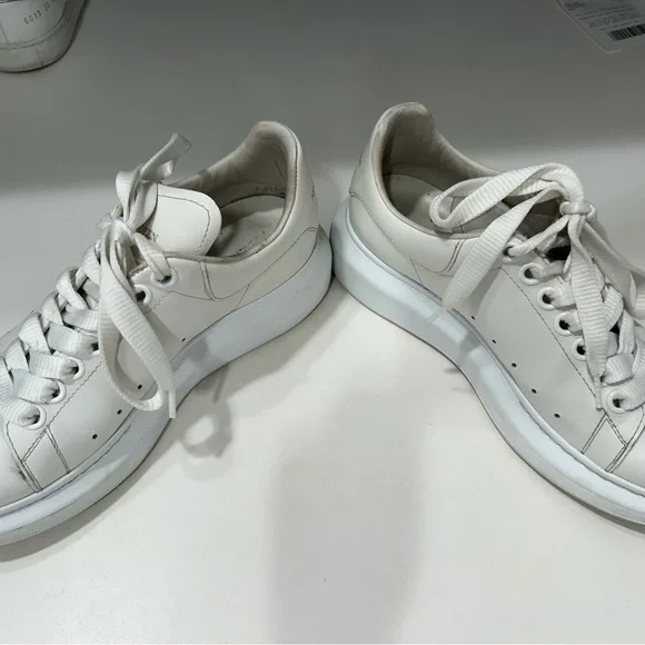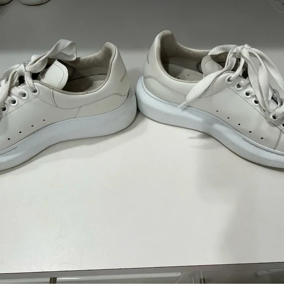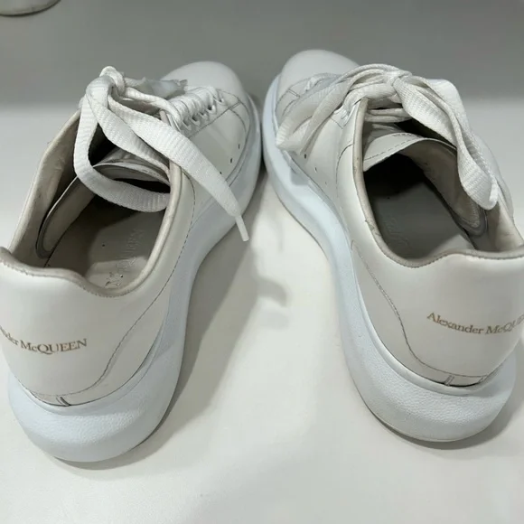 These Alexander McQueen sneakers boast a sophisticated blend of white and gold, crafted in a sleek low-top silhouette. The minimalist design is enhanced by premium materials and a durable rubber sole, offering both style and comfort for everyday wear. Excellent condition!