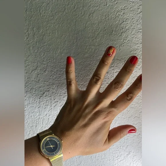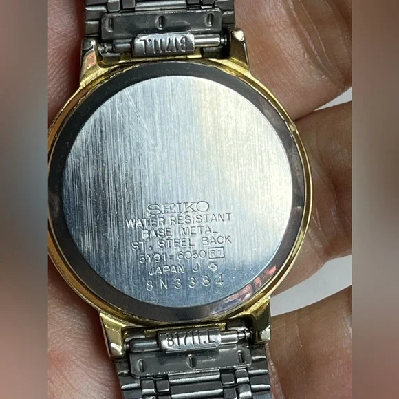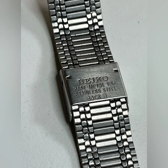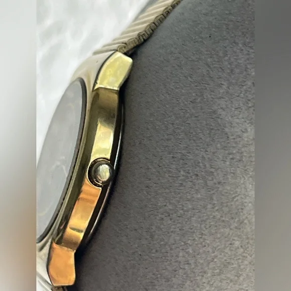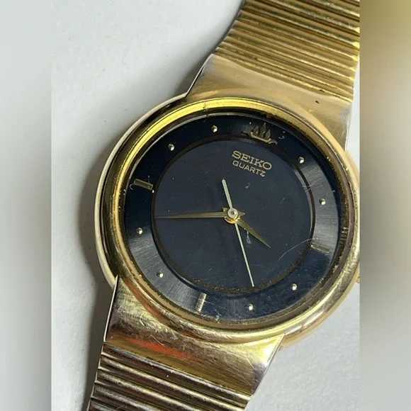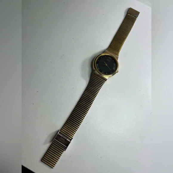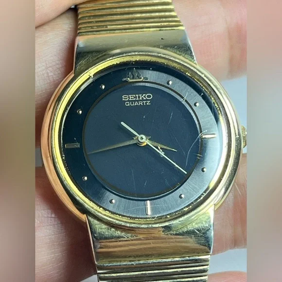 Great and authentic Seiko classic men’s watch. From 1980. All original!!Nice and clean sleek black dial. Features a classic Seiko gold band. (Kind of discolored due the age) Seiko clasp. Seiko Japan quartz movement working strong and perfect. Great crystal condition! Just one fine scratch not noticeable at all! Case size 31.5mm Super nice and retro!! From 1980!1022