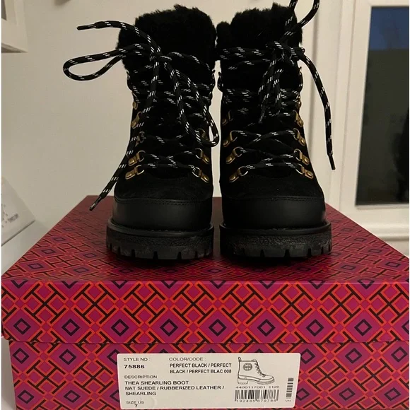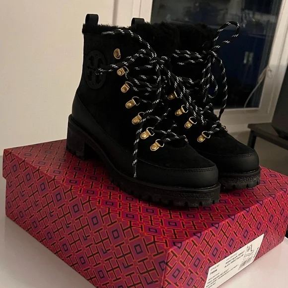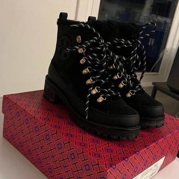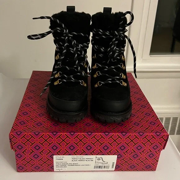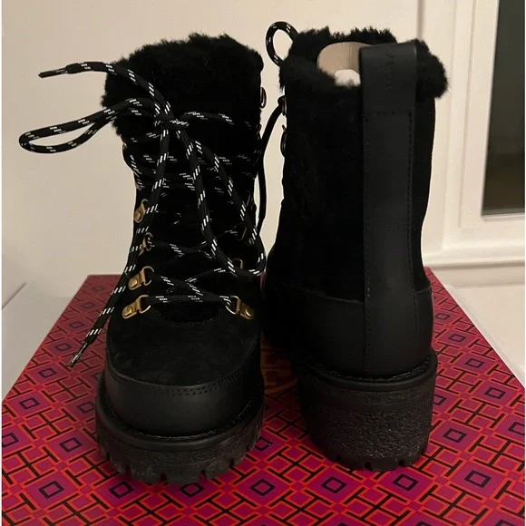 All orders ship next business day! Style: Tory Burch Thea Lug Sole BootMaterial: Shearling and Suede. BRAND NEW WITH TAGS! Color: Black Size: 7Shoes come in original box. Smoke free and pet free home!