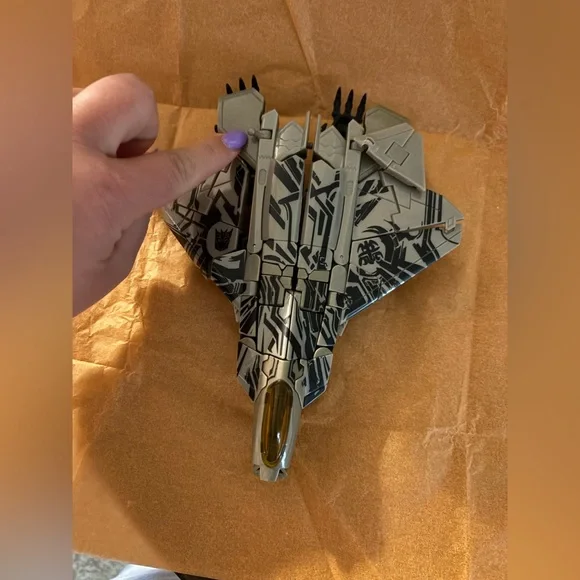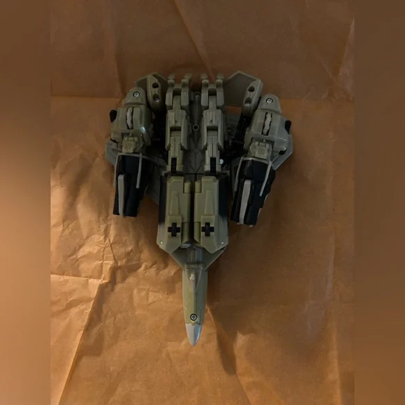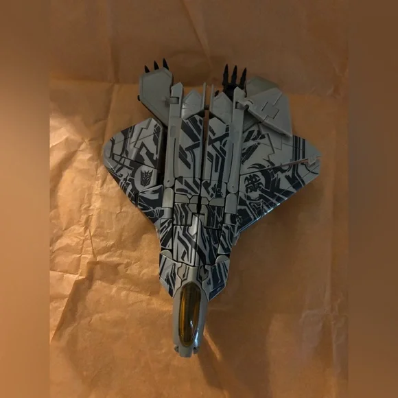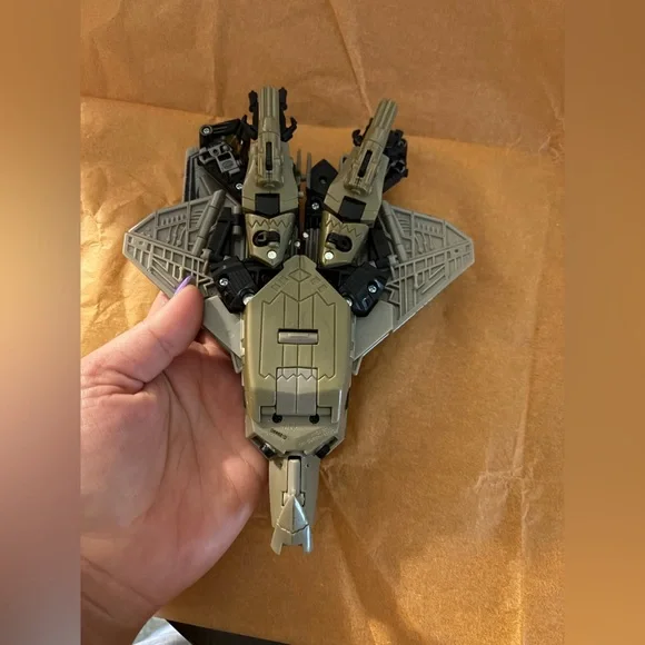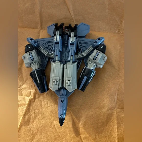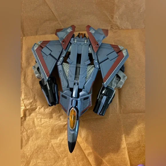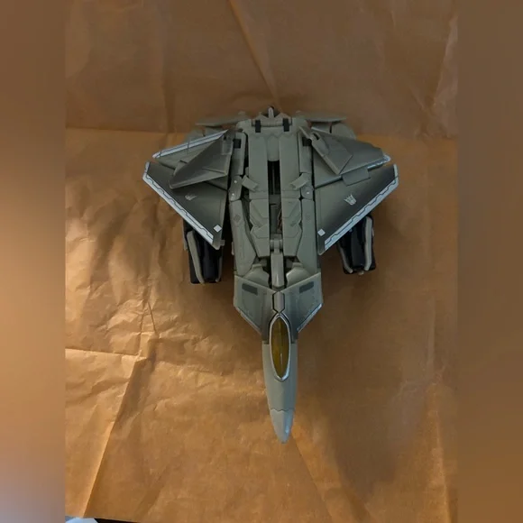 Transformers Movie RD-02 Starscream toy in its jet form, which is based on the character from the 2009 film Transformers: Revenge of the Fallen. This toy features detailed markings, including Cybertronian tattoos, and is designed to be durable. It is a highly sought-after collectible for Transformers enthusiasts.Starscream is a Decepticon. (Missing one little fin) Transformers Movie Voyager Class Starscream action figure, likely from the 2007 Transformers movie.This figure transforms between a robot and an F-22 Raptor jet.Transformers Studio Series 09 Voyager Class Thundercracker action figure. This Decepticon figure is inspired by the "Dark of the Moon" movie and transforms from a robot to a licensed F-22 Raptor jet.